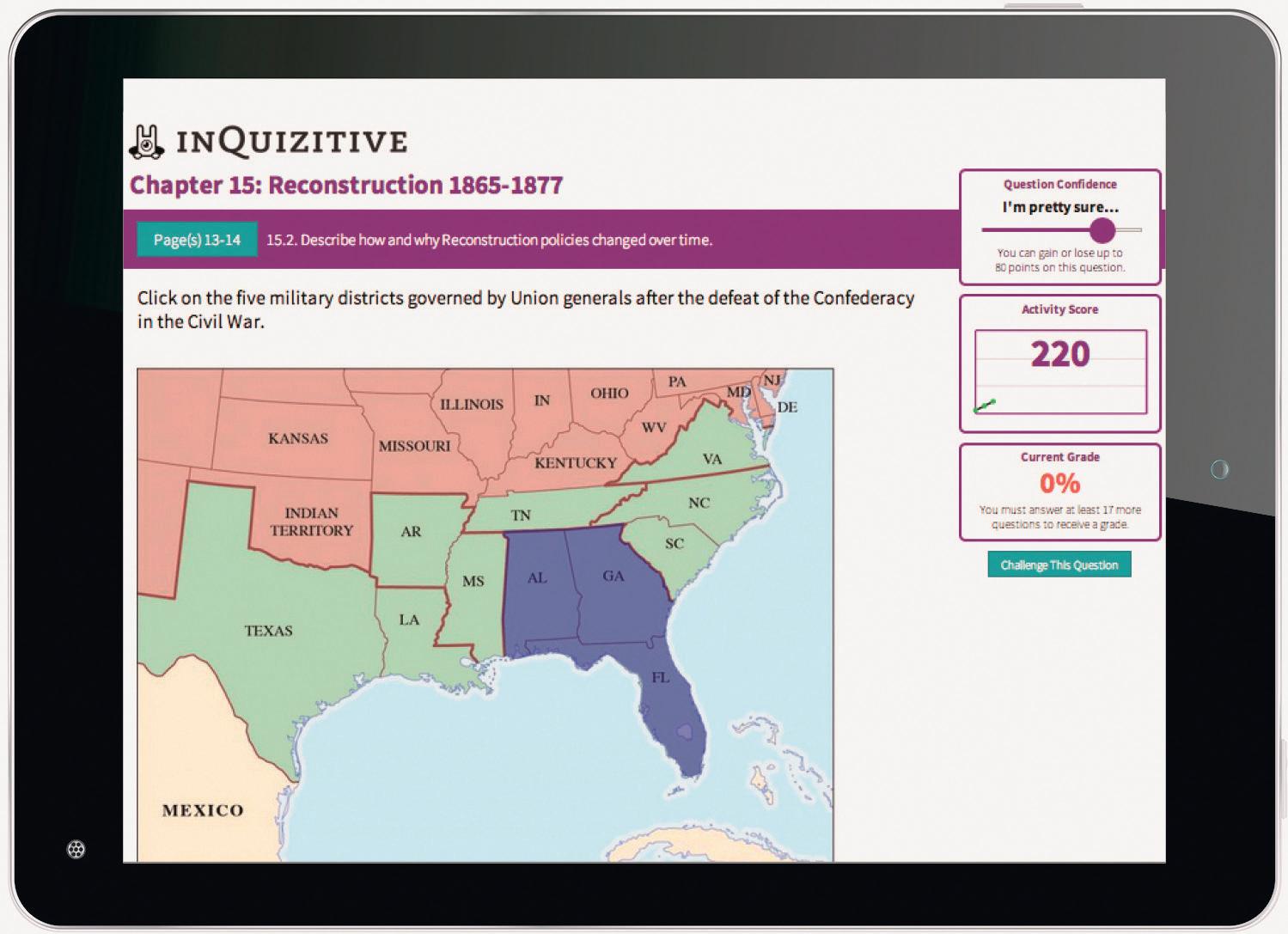 Norton InQuizitive uses interactive questions and guided feedback to motivate students to read and understand the key concepts, events, and historical developments. A variety of question types featuring images, maps, and sources prompt critical and analytical thinking on each of the chapter’s Core Objectives. In a case study with The Essential Learning Edition, First Edition, 80% of history students said they think InQuizitive helped them learn the material from the textbook, 88% of students said they prefer InQuizitive to previous standard multiple-choice quizzes, and 92% of students would recommend that the instructor continue using InQuizitive.