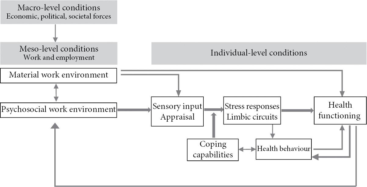 Summing up the arguments, we can state that analysing the impact of work and employment on health is a challenging task, given the difficulty of separating the work environment from the broader environment, and given the multifaceted nature of work environments. The former challenge is addressed by applying a multilevel approach where conditions operating at the macro-, meso-, and micro-level are distinguished. To tackle the second challenge, an interdisciplinary perspective is required that enables a combined study of material (physical, chemical, biological) and psychosocial (psychological, social) aspects of work environments. As health is the central outcome of interest, this interdisciplinary perspective is best realized in the frame of a biopsychosocial model of health and disease (En gel 1977). In this model, the three spheres of organism (molecules, genes, receptors, organs), individual person (emotions, cognitions, motivations), and social environment (macro-, meso-, micro-level conditions) are assumed to be interconnected by bi-directional pathways, reflecting the systemic nature of dynamic interactions between person and environment. Importantly, a main pathway is assumed to lead from the social environment (work demands) to the individual person (coping with these demands), whose action affects the health of the organism (through duration and intensity of psychobiological stress responses). This pathway will be of main interest in this book (see Part III). Yet, an alternative pathway is of interest as well. Impaired health at the level of the organism (e.g. reduced physical functioning) can