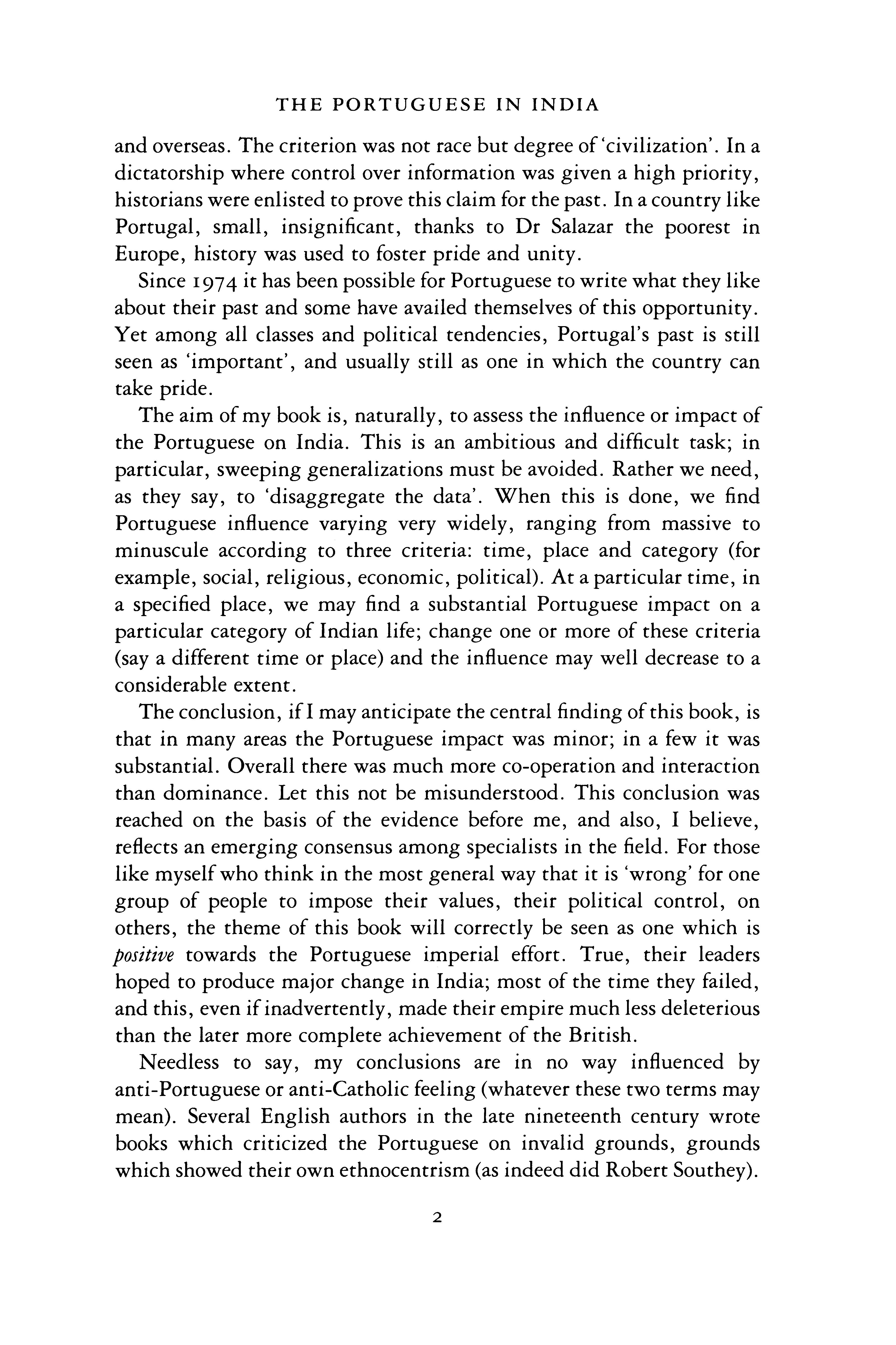 Th e aim of my book is , naturally , t o assess th e influence or impac t of th e Portugues e on India . Thi s is an ambitiou s and difficult task ; i n particular , sweeping generalization s mus t be avoided. Rathe r we need , as they say, t o 'disaggregat e th e data' . Whe n thi s is done , we find Portugues e influence varying very widely , rangin g from massive t o minuscul e according t o thre e criteria : time , place and category (for example , social, religious , economic , political) . A t a particula r time , in a specified place , we may find a substantia l Portugues e impac t on a particula r category of India n life; change one or more of these criteri a (say a different tim e or place) and th e influence may well decrease t o a considerable extent .