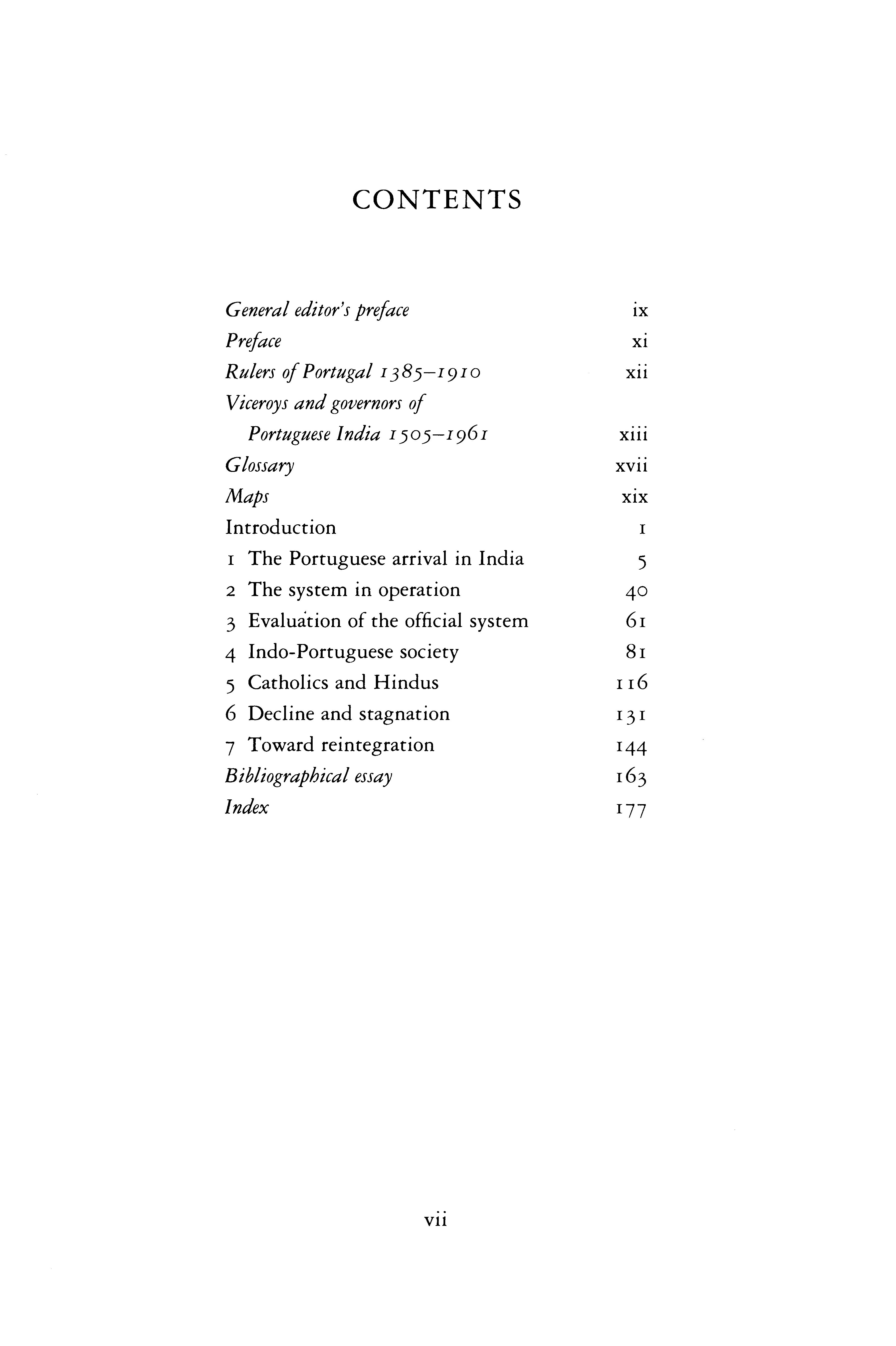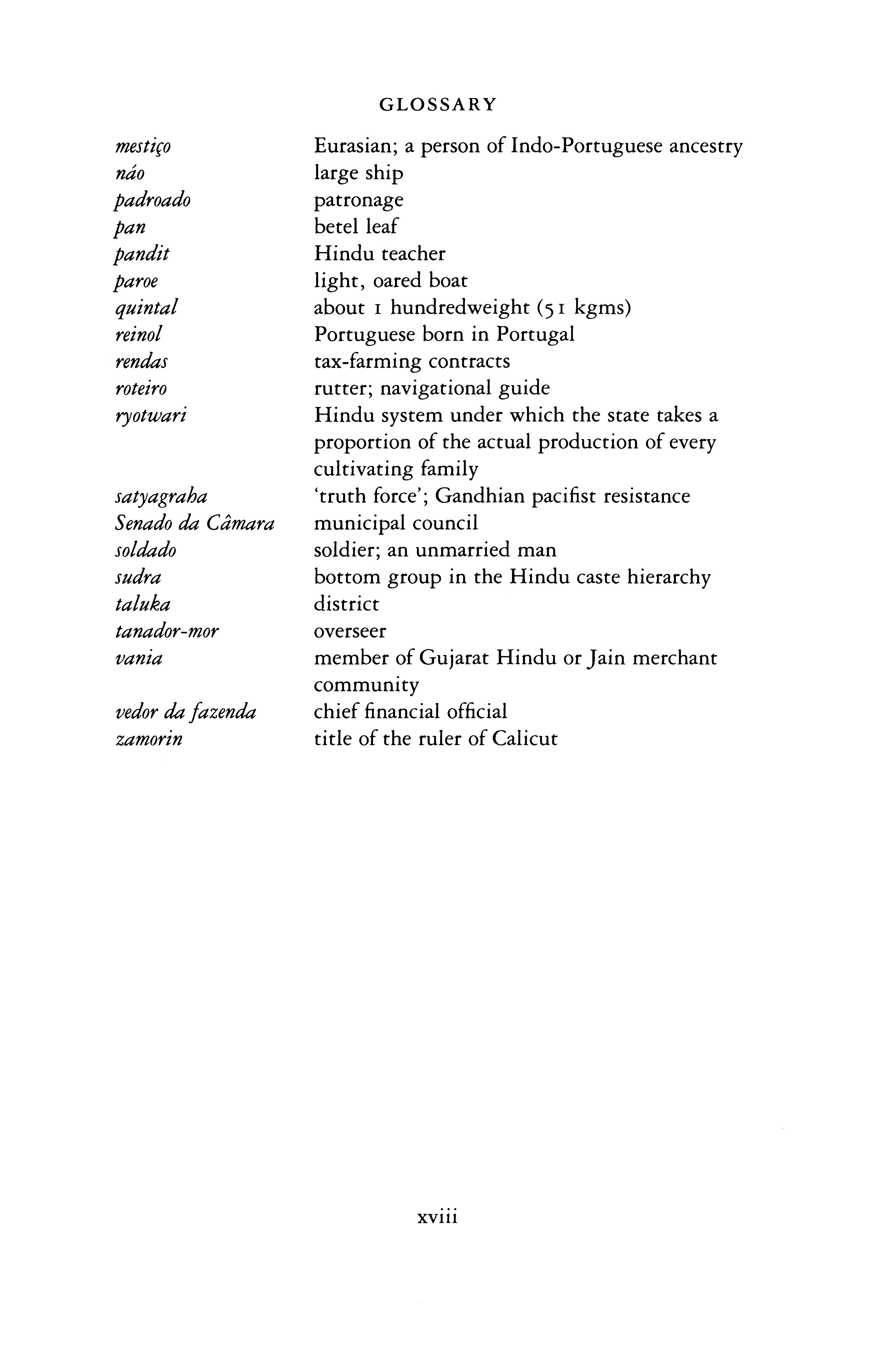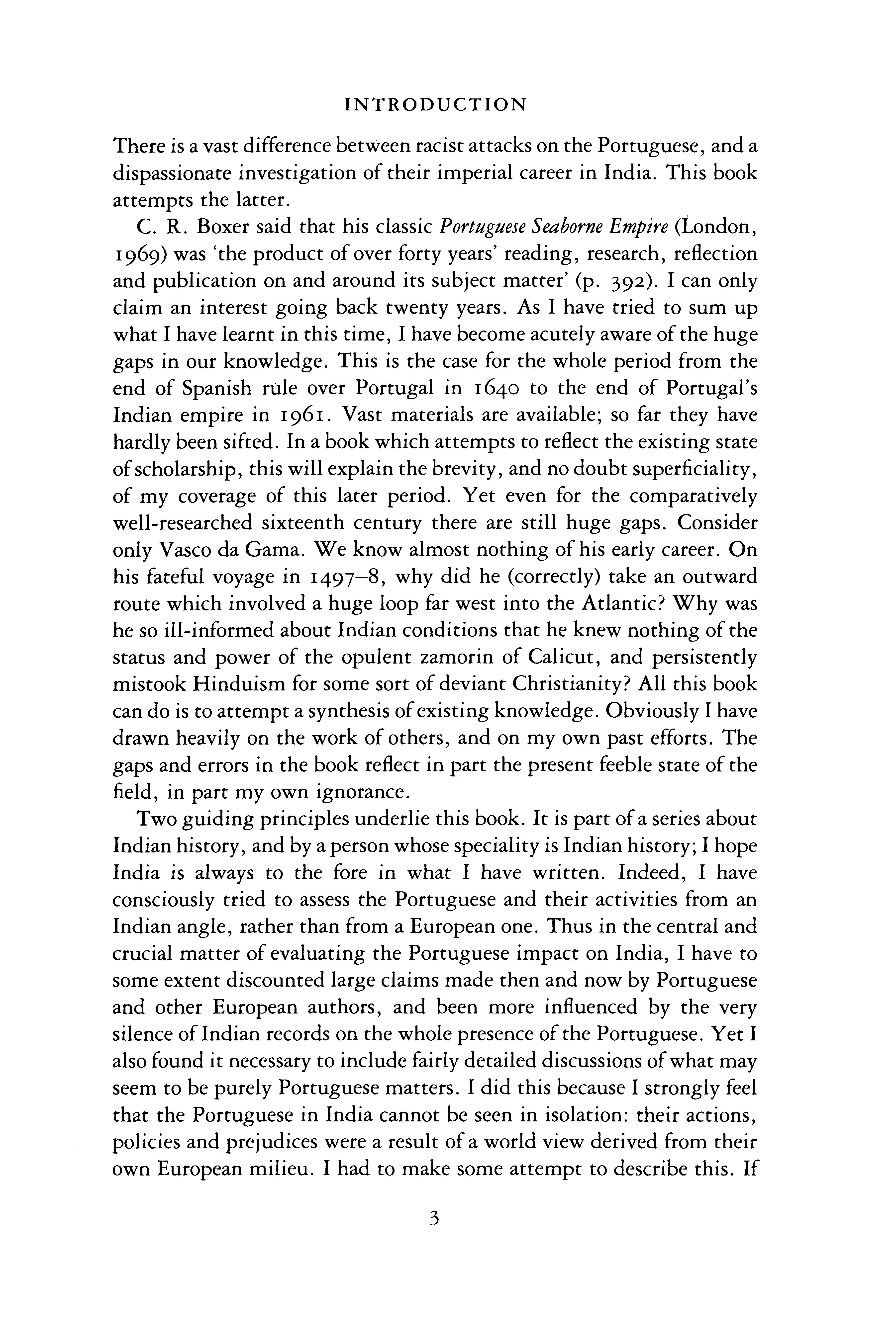 C. R . Boxer said tha t his classic Portuguese Seaborne Empire (London, 1969) was 'th e produc t of over forty years' reading , research, reflection and publicatio n on and around it s subject matter ' (p . 392) . I can only claim an interes t goin g back twent y years. As I have trie d t o sum u p wha t I have learn t in thi s time , I have become acutely aware of th e hug e gaps in our knowledge . Thi s is th e case for th e whole perio d from th e end of Spanish rul e over Portuga l in 1640 t o th e end of Portugal' s India n empir e in 1961 . Vast material s are available; so far they have hardly been sifted. I n a book whic h attempt s t o reflect th e existin g stat e of scholarship , thi s wil l explain th e brevity , and no doub t superficiality, of my coverage of thi s later period . Ye t even for th e comparatively well-researched sixteent h centur y ther e are stil l hug e gaps . Consider only Vasco da Gama . W e know almos t nothin g of his early career. O n his fateful voyage i n 1497—8, why di d he (correctly) tak e an outwar d rout e whic h involved a hug e loop far west int o th e Atlantic ? Wh y was he so ill-informed abou t India n condition s tha t he knew nothin g of th e statu s and power of th e opulen t zamorin of Calicut , and persistentl y mistoo k Hinduis m for some sort of devian t Christianity ? All thi s book can do is t o attemp t a synthesis of existin g knowledge . Obviousl y I have draw n heavily on th e work of others , and on my own past efforts. Th e gaps and errors in th e book reflect in par t th e presen t feeble stat e of th e field, in par t my own ignorance .