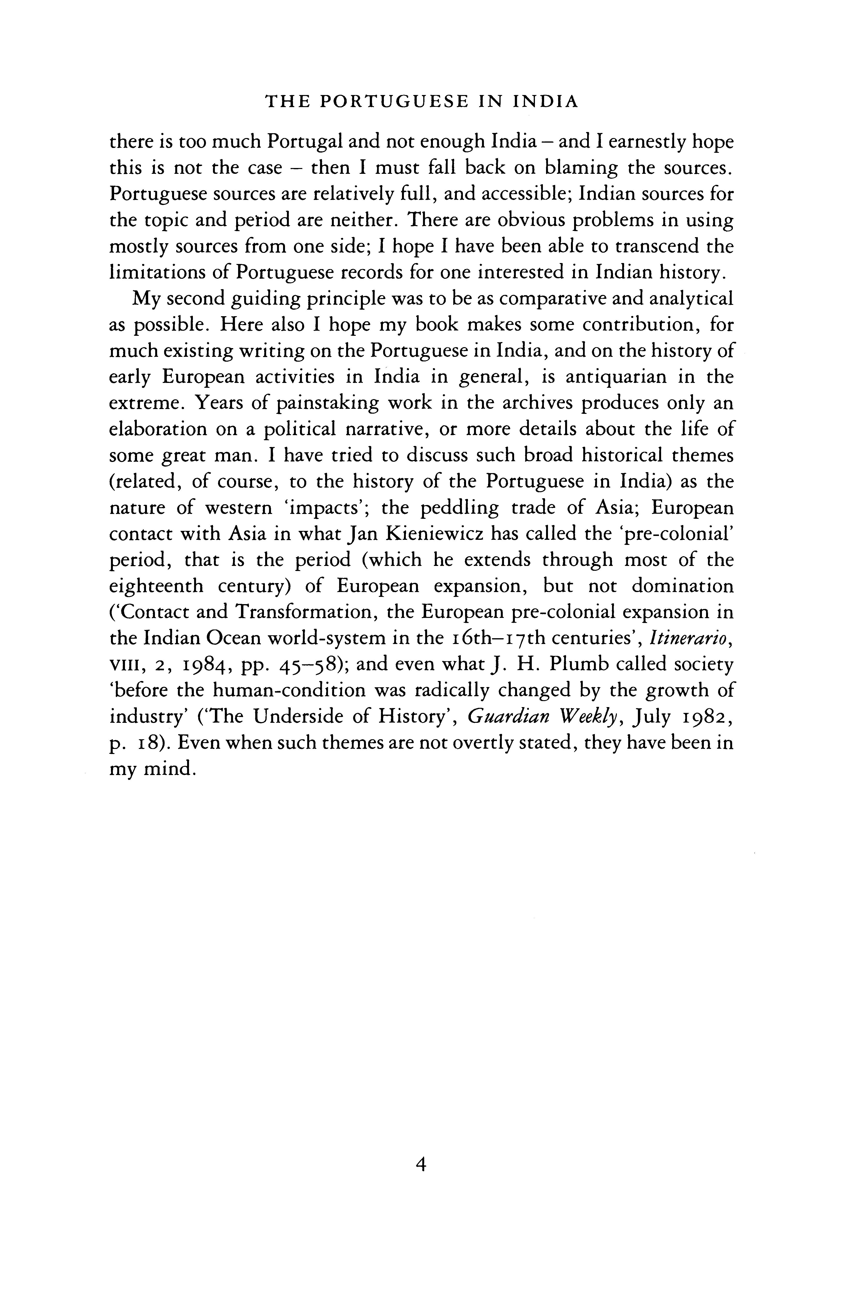 ther e is too muc h Portuga l and no t enoug h Indi a - and I earnestly hope thi s is no t th e case — the n I mus t fall back on blamin g th e sources Portugues e sources are relatively full, and accessible; India n sources for th e topi c and perio d are neither . Ther e are obvious problem s i n usin g mostl y sources from one side; I hope I have been able t o transcen d th e limitation s of Portugues e records for one intereste d in India n history . My second guidin g principl e was t o be as comparativ e and analytical as possible . Her e also I hope my book makes some contribution , for muc h existin g writin g on th e Portugues e in India , and on th e histor y of early European activitie s in Indi a in general , is antiquaria n in th e extreme . Years of painstakin g work in th e archives produces only an elaboratio n on a politica l narrative , or mor e detail s abou t th e life of some grea t man . I have trie d t o discuss such broad historica l theme s (related , of course, t o th e histor y of th e Portugues e i n India ) as th e natur e of western 'impacts' ; th e peddlin g trad e of Asia; European contac t wit h Asia in wha t Ja n Kieniewicz has called th e 'pre-colonial ' period , tha t is th e perio d (which he extend s throug h mos t of th e eighteent h century ) of European expansion, bu t no t dominatio n ('Contact and Transformation , th e European pre-colonial expansion in th e India n Ocean world-syste m in th e 16th—17th centuries' , Itinerario, VIII , 2 , 1984 , pp . 45-58) ; and even wha t J . H . Plum b called society 'before th e human-conditio n was radically changed by th e growt h of industry ' ('Th e Undersid e of History' , Guardian Weekly, Jul y 1982 , p . 18). Even whe n such theme s are no t overtly stated , they have been in my mind .