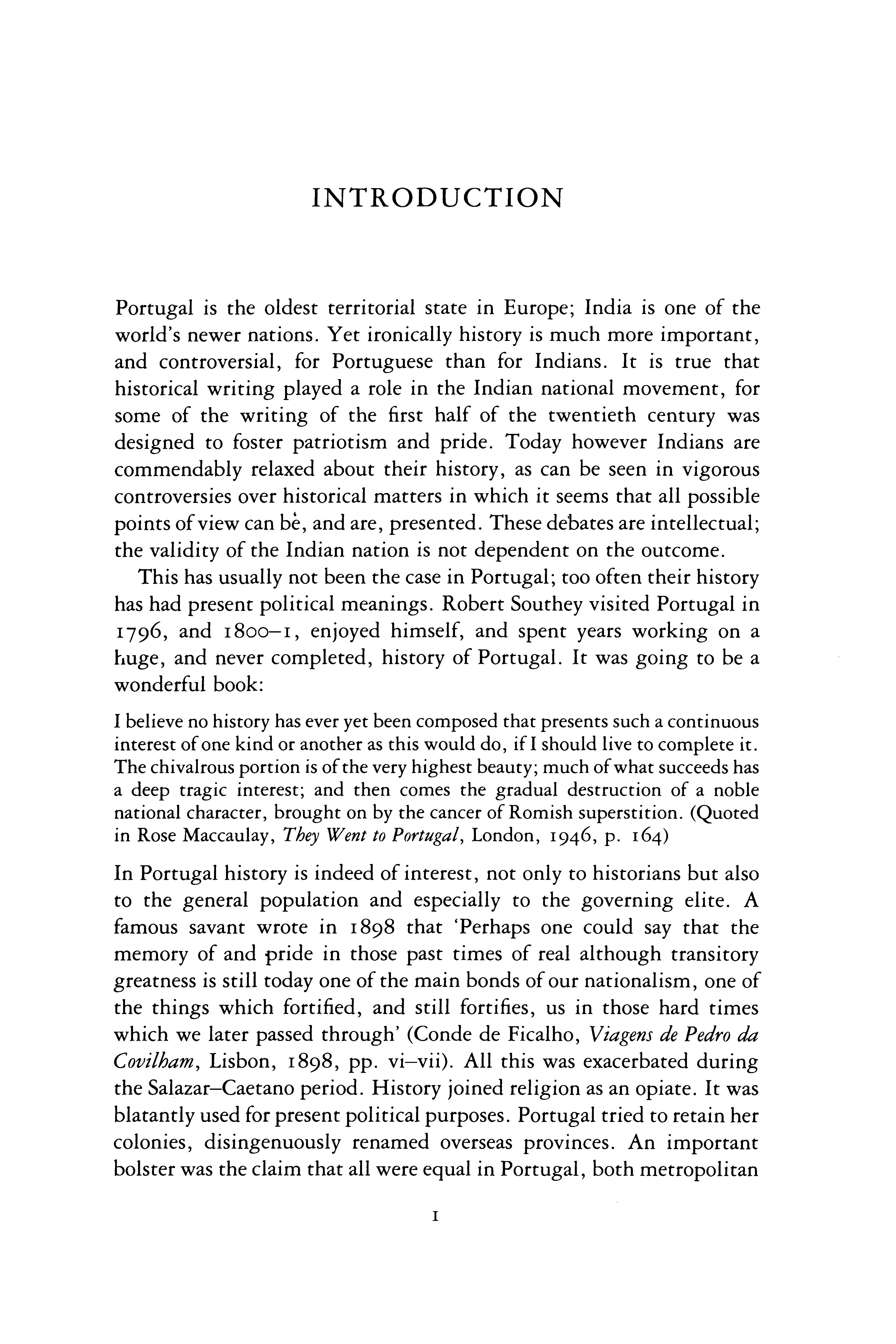 Portuga l is th e oldest territoria l stat e in Europe ; Indi a is one of th e world' s newer nations . Ye t ironically histor y is muc h mor e important , and controversial , for Portugues e tha n for Indians . I t is tru e tha t historical writin g played a role in th e India n nationa l movement , for some of th e writin g of th e first half of th e twentiet h centur y was designe d t o foster patriotis m and pride . Today however Indian s are commendabl y relaxed abou t thei r history , as can be seen in vigorous controversies over historica l matter s in whic h i t seems tha t all possible point s of view can be , and are , presented . These debate s are intellectual ; th e validit y of th e India n natio n is no t dependen t on th e outcome . Thi s has usually no t been th e case in Portugal ; too often thei r histor y has had presen t politica l meanings . Rober t Southey visite d Portuga l in 1796 , and 1800—1, enjoyed himself, and spen t years workin g on a huge , and never completed , histor y of Portugal I t was goin g t o be a wonderful book: