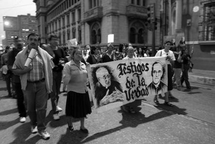 Vigil for Bishop Juan José Gerardi on the fifteenth anniversary of his murder in Guatemala City in 1998. The banner reads “Witnesses of Truth.” Reuters / Alamy Stock Photo