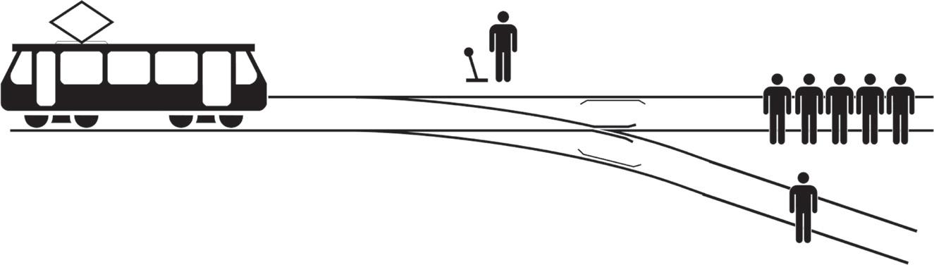 FIGURE 1.2. Trolley dilemma. A runaway trolley is hurtling toward five workers who are unaware of the trolley coming. You can save their lives by pulling a lever to divert the trolley to a sidetrack. However, there is a lone worker in the sidetrack who is also unaware of the trolley coming. What would you do? Would you kill one person to save five? Figure reproduced with permission from McGeddon, “File:Trolley Problem.svg,” Wikimedia Commons, updated March 6, 2018, https://commons.wikimedia.org/wiki/File:Trolley_Problem .svg (CC BY-SA 4.0).