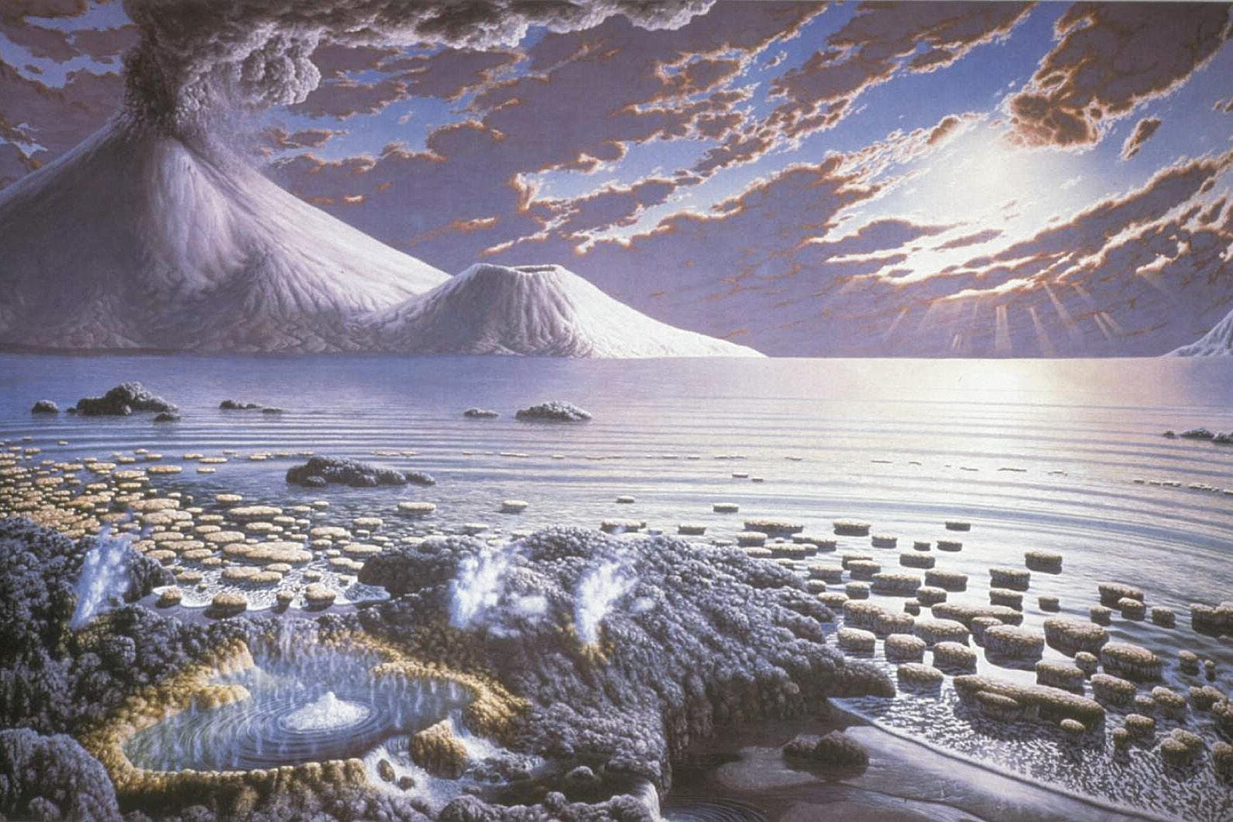 The Archean World. Courtesy of the Smithsonian Institution. Painting by Peter Sawyer. [http://ocean.si.edu/slideshow/ ocean-throughout-geologic-time-image-gallery]