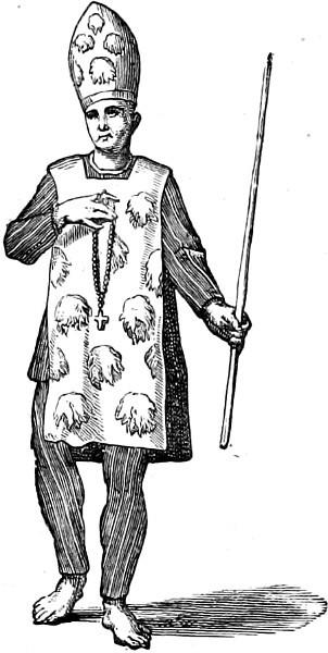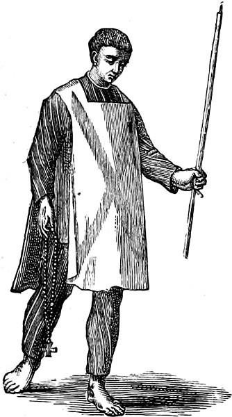There were many kinds of san-benito for different classes of penitents. The first, for heretics who were reconciled to the Church before sentence had been passed, consisted of a yellow scapulary, with large reddish-coloured St. Andrew’s cross, and of a round pyramid-shaped cap called coroza, of the same material as the sanbenito and with similar crosses; but no flames were represented on the garments, as the accused by timely repentance had escaped the punishment of burning (Fig. 335).