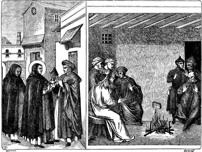 Narbonne, Viviers, Carcassonne, and Montpellier, but the heretics only displayed greater perseverance. Peter de Castelnau and Brother Ralph, disheartened at this result, enlisted in their difficult mission twelve brothers of their own order and two distinguished Spanish prelates—Diego de Azeles, Bishop of Osma, and the sub-prior of his cathedral, Dominic Guzman, who, having witnessed the progress of heresy in Languedoc, went to Italy to obtain the Holy Father’s permission to preach against it. Dominic had given proof of a gentleness, zeal, and piety worthy of the apostles, and the renown of his exemplary life was counted upon to give authority to his preaching (Fig. 331). Yet he was no less unsuccessful than the preceding commissioners sent by the pope. Insulted and mocked by an ignorant and brutal populace, he could not help exclaiming, “O Lord, let thy hand smite them, that thy punishment at least may open their eyes!” The legate Peter de Castelnau, in despair at the failure of his efforts to restore quietude and faith to men’s minds, determined to address himself directly to the Count of Toulouse, Raymond VI., and to formally demand of him to lend his aid to the papal legates, or else to proclaim openly that he sided with the heretics. After an interview during which bitter language was exchanged, two of the esquires of the Count of Toulouse believed that they would be complying with their master’s secret wishes by assassinating the courageous legate upon the banks of the Rhône (1208). Innocent III., when the news of this murder reached him, at once determined to set on foot a new crusade against the Albigenses. He appointed Milon in the room of Peter de Castelnau, and declared that he took under his immediate protection all the faithful who should take up arms for the defence of the Church. The Count of Toulouse did public penance, and his nephew Raymond Viscount of Béziers was handed over to the papal legates. The town of Béziers, taken by assault (July 22nd, 1209), was a scene of terrible carnage, for the crusaders gave no quarter—twenty thousand inhabitants were massacred without distinction of age or sex, and seven thousand were burnt in a church in which they had taken refuge.