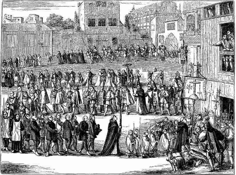 Fig. 334. An Auto-da-fé Procession, in Spain, according to the ceremonial observed from the Fourteenth Century. Fac-simile of a large Engraving on copper in the work of Philip of Limborch, entitled “Historia Inquisitionis:” folio, Amsterdam, 1692.