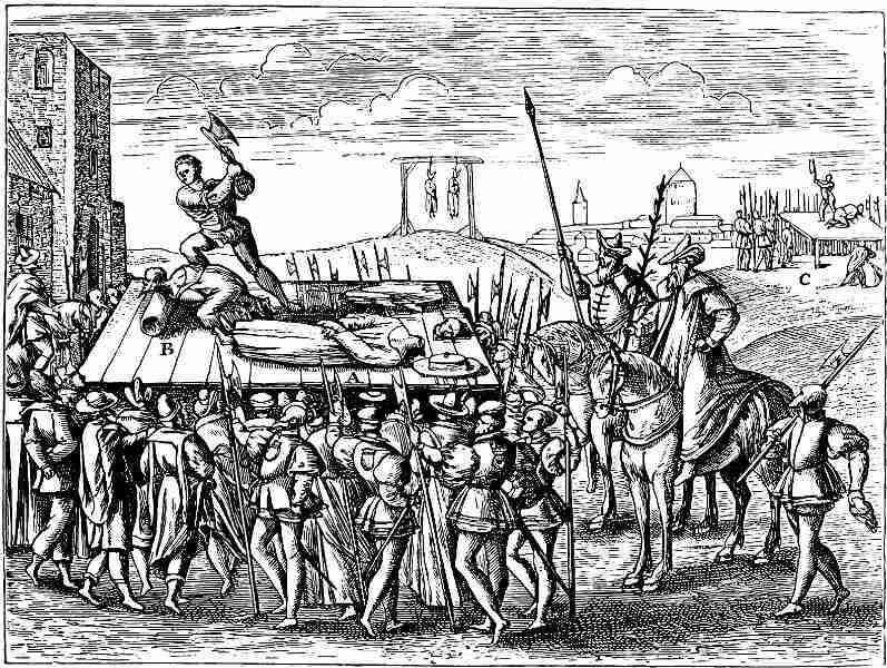 unity—Spain was outdone in the refinement of punishments which they invented to use against the Catholics who refused to change their faith (Fig. 339). Nor was it against the Catholics only that the Protestant Inquisition exercised its rigorous authority. In countries where Calvinists and Lutherans were brought into juxtaposition, religious persecution broke out between the various reformed Churches, always, too, under the instinctive influence that religious unity was necessary to ensure the stability of the State. A distinguished writer, Menzel, in his “New History of the Germans since the Reformation,” gives some very interesting details concerning this internecine struggle. At the end of the sixteenth century, when, at the death of the Elector of Saxony, Christian I., on September 25th, 1591, the government of Saxony fell into the hands of Duke William of Altenburg, who was a rigid Lutheran, the Calvinist party in Germany thought that the golden age was about to return. Chancellor Crell, who in Christian’s lifetime had treated the Lutherans with slight show of mercy, was cast into prison, together with Gunderman, a Leipsic preacher. After five months’ incarceration, the latter signed the “Formula of Concord,” in order that he might be able to visit his wife, whom he had left enceinte, but he had no sooner appended his signature than he was told that she had hung herself in a fit of despair. The unfortunate man went out of his mind. Other preachers were treated with almost equal severity; and at Leipsic, in 1593, the Lutheran party set fire to the houses of the Calvinists, who had to fly from the city to escape assassination. Such was also the case in Silesia. Upon the 22nd of September, 1601, Chancellor Crell was condemned to death, after having been kept ten years in prison, and he was beheaded on the 10th of October.