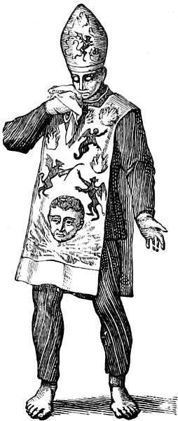 The second, for those who, sentenced to be burnt, had subsequently recanted, was made up of a san-benito and a coroza of the same material. The scapulary was covered with tongues of fire pointing downwards, to indicate that the wearer (Fig. 336) would not be burnt alive, inasmuch as he was to be strangled before being placed upon the burning pile.