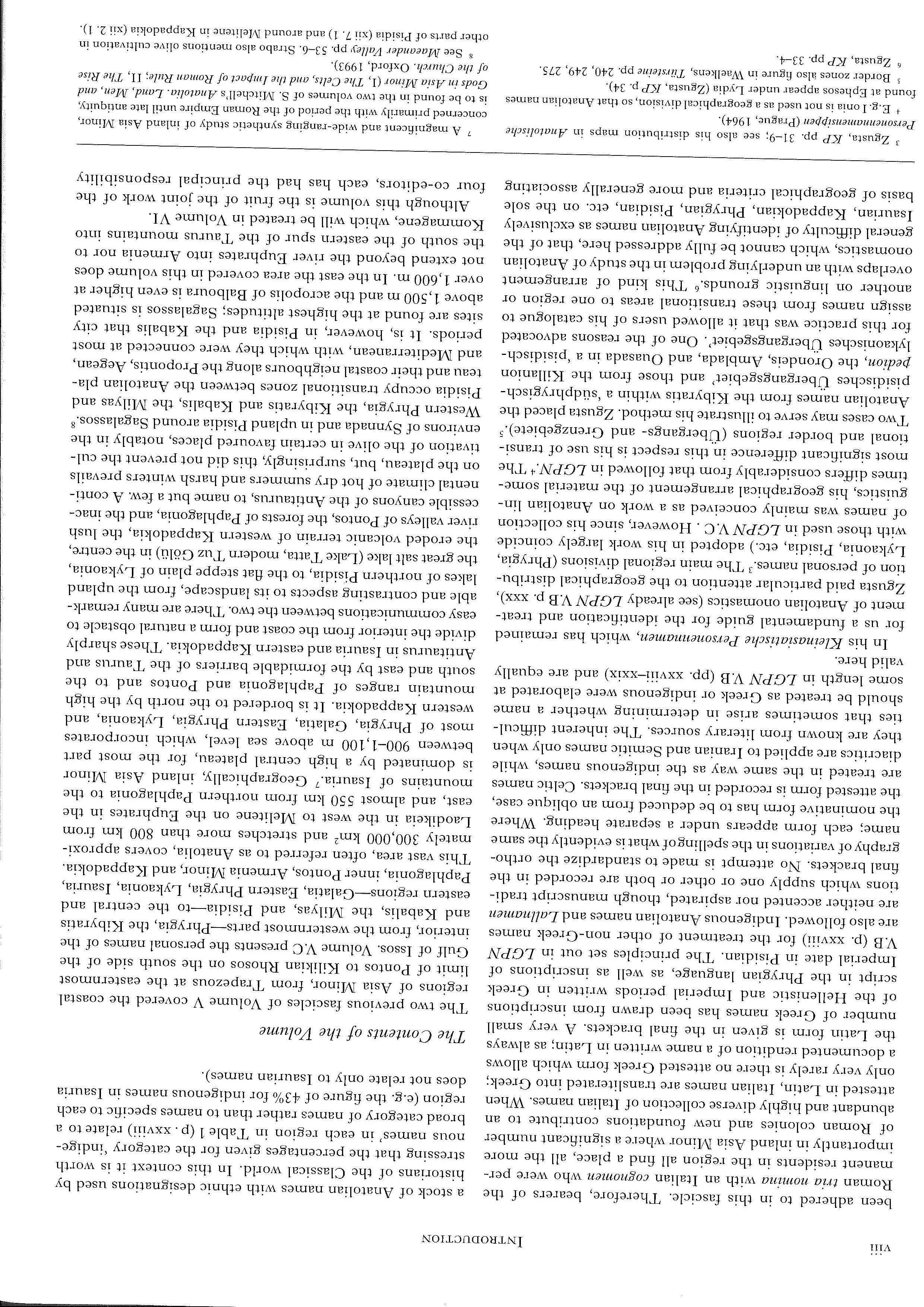 In his I<:.leinasiatischePersonennamen, which has remained for us a fundamental guide for the identification and treatment of Anatolian onomastics (see already LGPN VB p. xxx), Zgusta paid particular attention to the geographical distribution of personal names. 3 The main regional divisions (Phrygia, Lykaonia, Pisidia, etc.) adopted in his work largely coincide with those used in LGPN V.C. However, since his collection of names was mainly conceived as a work on Anatolian linguistics, his geographical arrangement of the material sometimes differs considerably from that followed in LGPN.+ The most significant difference in this respect is his use of transitional and border regions (Ubergangs- and Grenzgebiete). 5 Two cases may serve to illustrate his method. Zgusta placed the Anatolian names from the Kibyratis within a 'siidphrygischpisidisches Ubergangsgebiet' and those from the Killanion pedion, the Orondeis, Amblada, and Ouasada in a 'pisidischlykaonisches Ubergangsgebiet'. One of the reasons advocated for this practice was that it allowed users of his catalogue to assign names from these transitional areas to one region or another on linguistic grounds. 6 This kind of arrangement overlaps with an underlying problem in the study of Anatolian onomastics, which cannot be fully addressed here, that of the general difficulty of identifying Anatolian names as exclusively !saurian, Kappadokian, Phrygian, Pisidian, etc. on the sole basis of geographical criteria and more generally associating