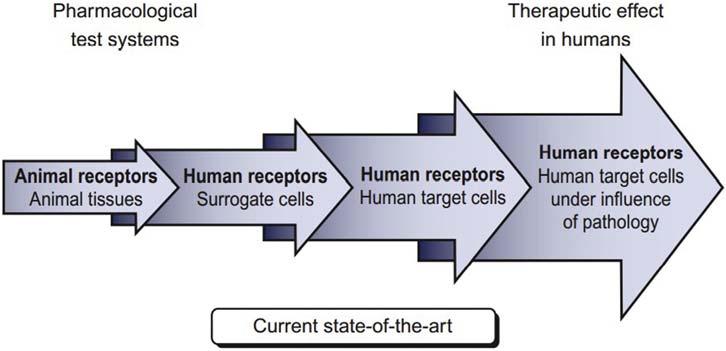 Afrequentlyusedstrategyindrugdiscoveryistoexpresshumanreceptors(through transfection withhuman cDNA)inconvenientsurrogatehostcells(referredtoas “target-based” drugdiscovery;seeChapter10:Safety Pharmacologyforfurtherdiscussion).Thesehostcellsare chosenmainlyfortheirtechnicalproperties(i.e.,robustness,growthrate,stability)andnotwithanyknowledgeof verisimilitudetothetherapeuticallytargetedhumancell type.Therearevariousfactorsrelevanttothechoiceof surrogatehostcell,suchasaverylow-backgroundactivity (i.e.,acellcannotbeusedthatalreadycontainsarelated animalreceptorforfearofcross-reactivitytomolecules targetedforthehumanreceptor).Humanreceptorsareoften expressedinanimalsurrogatecells.Themainideahereis thatthecellisareceptacleforthereceptor,allowingitto producephysiologicalresponses,andthatactivitycanbe monitoredinpharmacologicalexperiments.Inthissense, humanreceptorsexpressedinanimalcellsarestillatheoreticalstepdistancedfromthehumanreceptorinahuman celltype.However,evenifahumansurrogateisused(and therearesuchcellsavailable),thereisnodefinitiveevidencethatasurrogatehumancellisanymorepredictiveof anaturalreceptoractivitythanananimalcellwhen comparedtothecomplexreceptorbehaviorinitsnatural hostcelltypeexpressedunderpathologicalconditions. Receptorphenotypedominatesintheendorgan,andthe exactdifferencesbetweenthegenotypicbehaviorofthe receptor(resultingfromthegeneticmakeupofthereceptor) andthephenotypicbehaviorofthereceptor(duetothe interactionofthegeneticproductwiththerestofthecell) maybecellspeci fic.Therefore,thereisstillapossiblegap