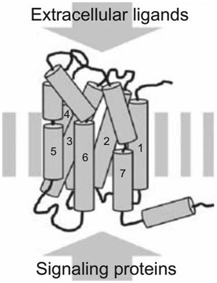 FIGURE1.6 Depictionofthestructureofseventransmembranedomain receptors,oneofthemostifnotthemostimportanttherapeutictargets availableinthehumangenome.Chemicalsaccessthereceptorthroughthe extracellularspacebybindingtotheextracellulardomainsoftheprotein. Thiscausesaconformationalchangeintheproteinthatalterstheinteractionofsignalingproteinsinthecellcytosol.Thislatterprocessresultsin theinitiationofcellularsignaling.