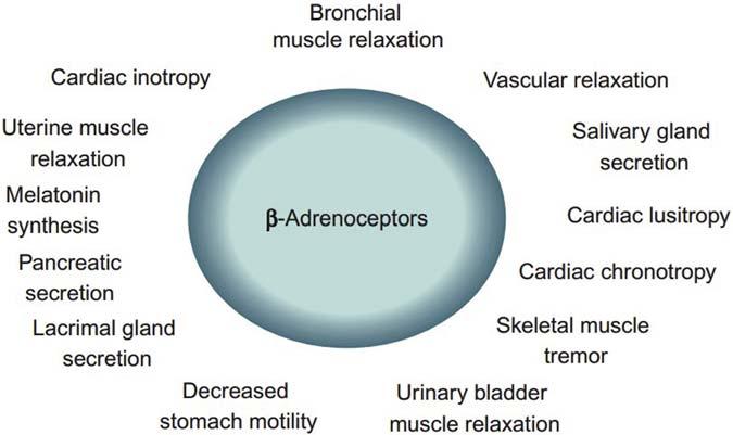 FIGURE1.2 Asamplingoftheheterogeneousphysiologicalandpharmacologicalresponsetothehormoneepinephrine.Theconceptofreceptorslinks thesediverseeffectstoasinglecontrolpoint,namely,the b-adrenoceptor.