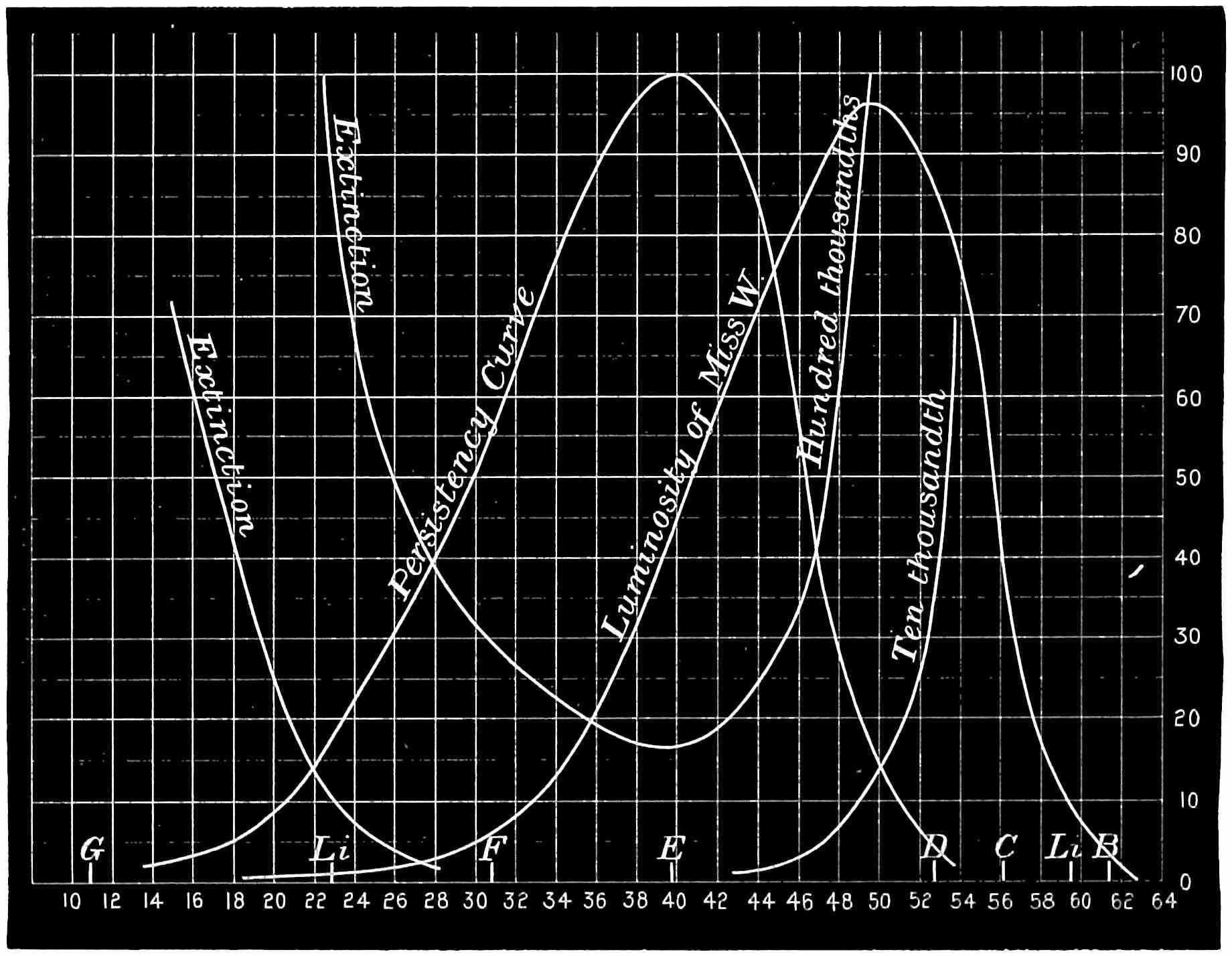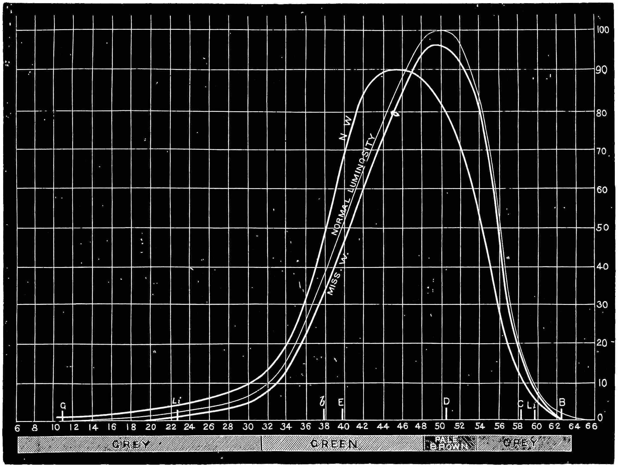 Her curve of luminosity in the spectrum was next taken, and her readings are given in the table above. The curve is shown in Fig. 40. The shaded band beneath it applies to her curve. Miss W.’s luminosity curve is also repeated in the same figure for the sake of comparison.