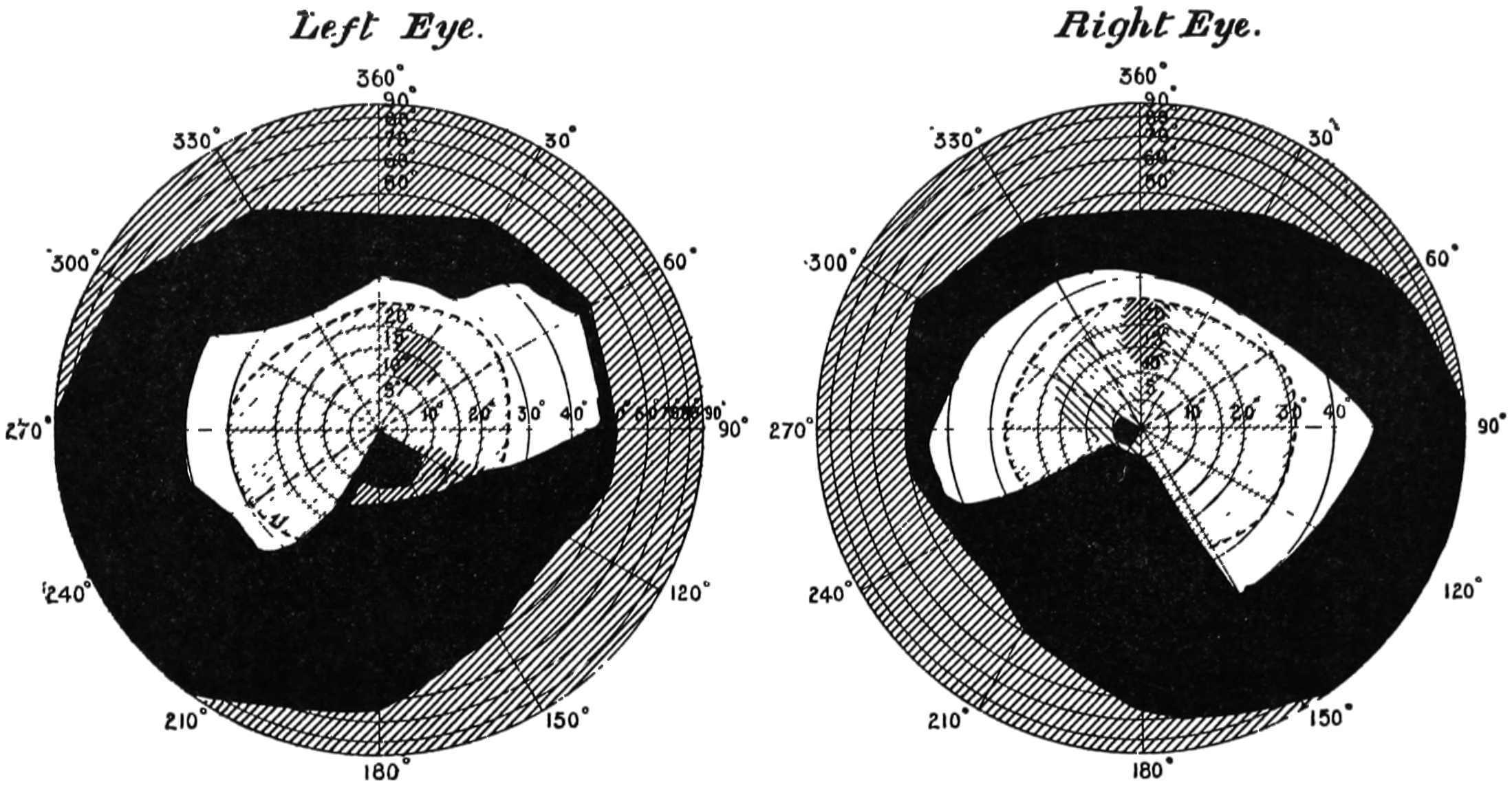 I have already shown you a chart of the insensitive area of the retina found in a tobacco-blind case, and it may be advisable that you should see an example of the curtailment that exists, both for light and colour, in the field of vision of eyes in which there is