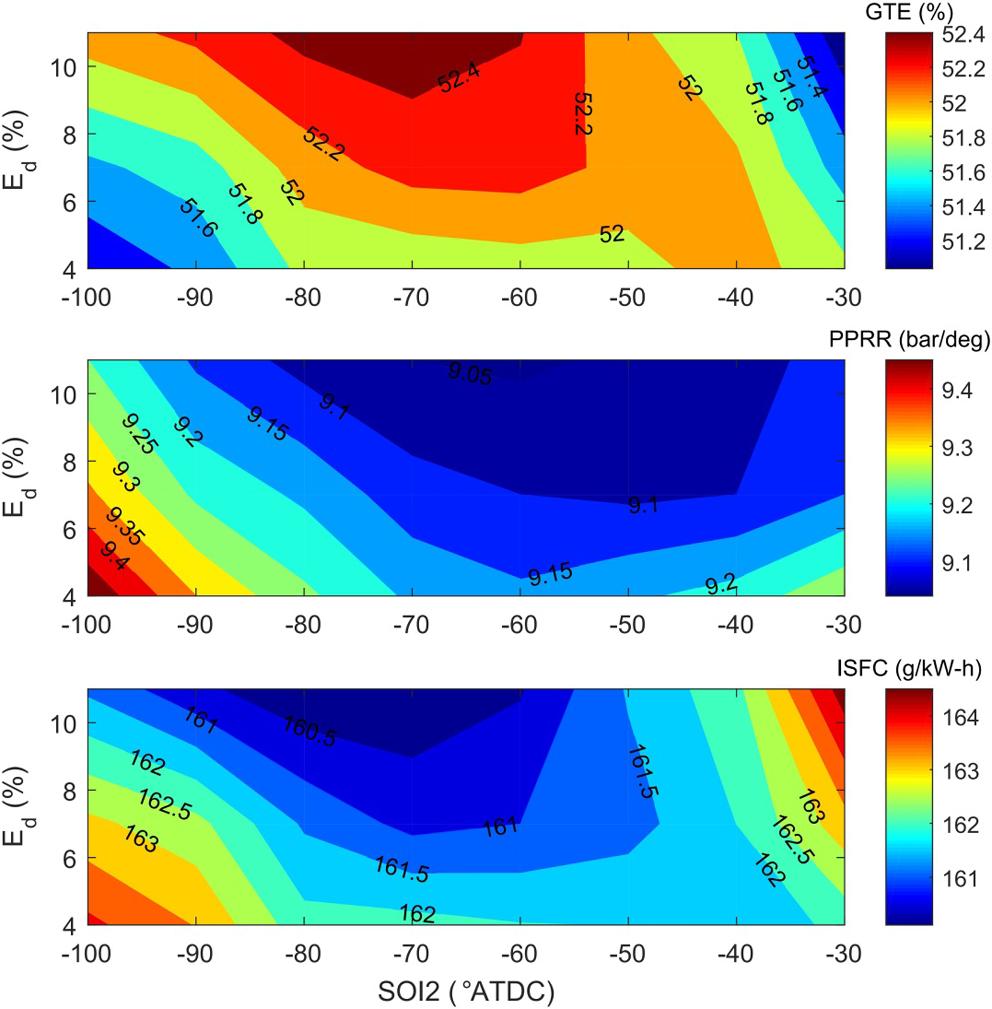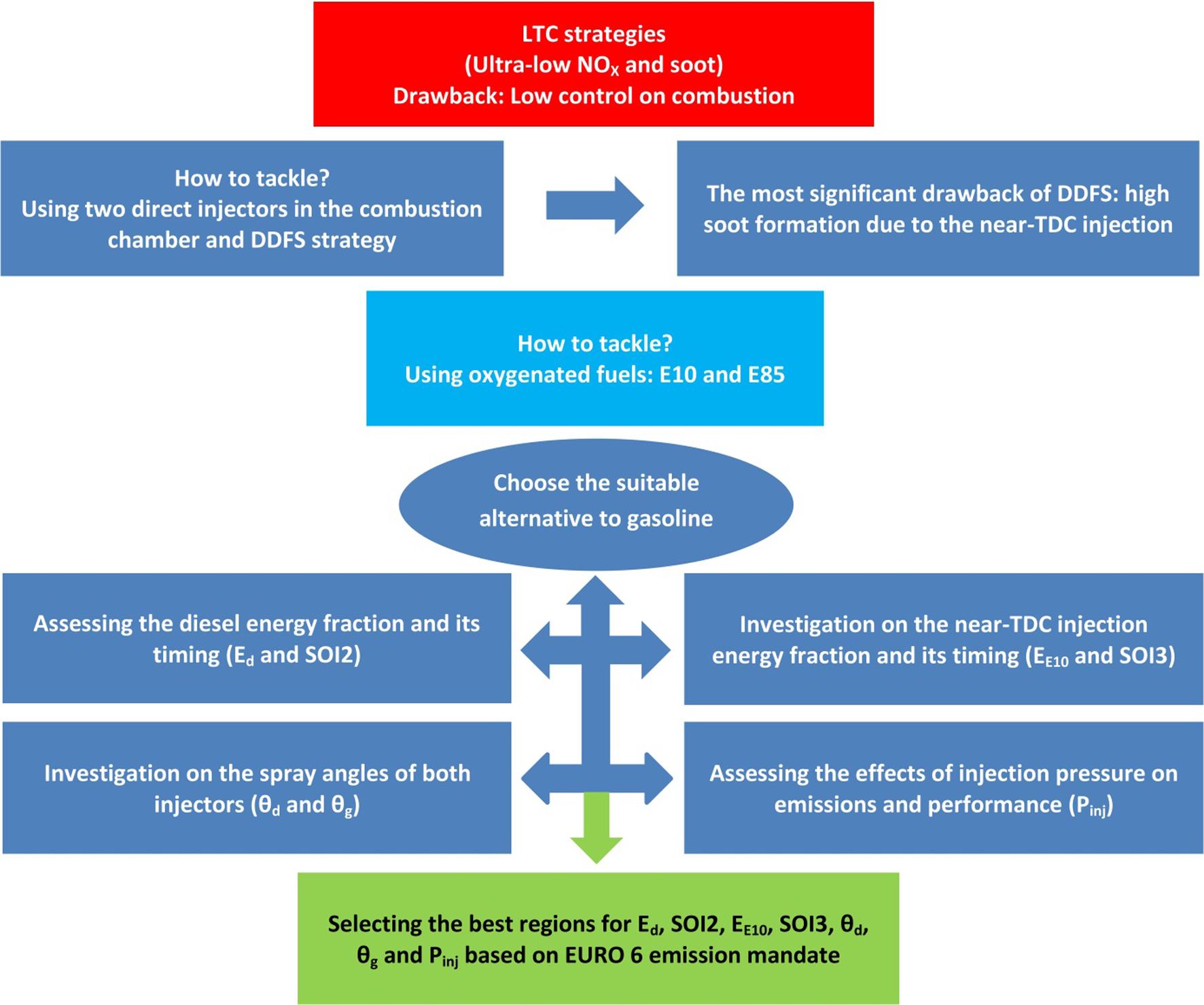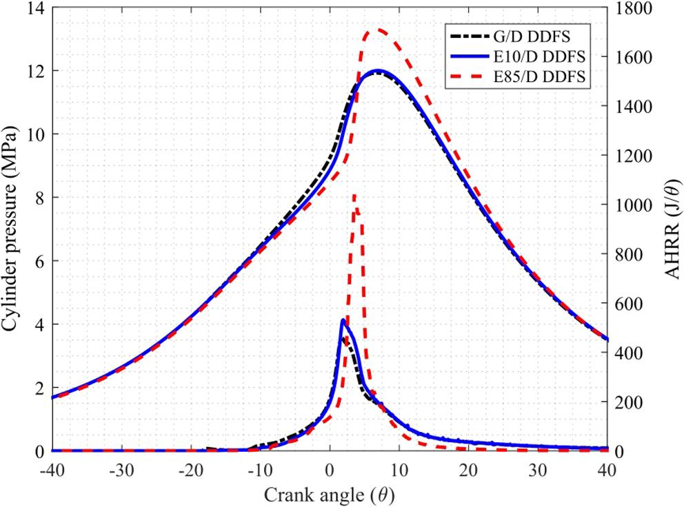 betweenE10andE85asalternativestogasolineregardingemissions andperformancecriteria.Thepaperisacomprehensivestudyonthe effectsofdieselenergyfractionanditstimingonemissionsandperformance.Inaddition,theenergyfractionofthenear-TDCinjectionand itstimingwasswept,andthebestregionbasedontheEURO6emissions mandatewaschosen.TheDDFScombustioncanmeetEURO6without aftertreatment.Thecombustionchamberhastwodirectinjectors,and theirsprayangleswereswept,andthebestregionsforthesprayangles werealsochosen.Finally,theeffectsofinjectionpressureofthenearTDCinjectionwerestudied,andthesuitablerangeofinjectionpressure forDDFScombustionwaschosenbasedontheEURO6emissionsregulation.