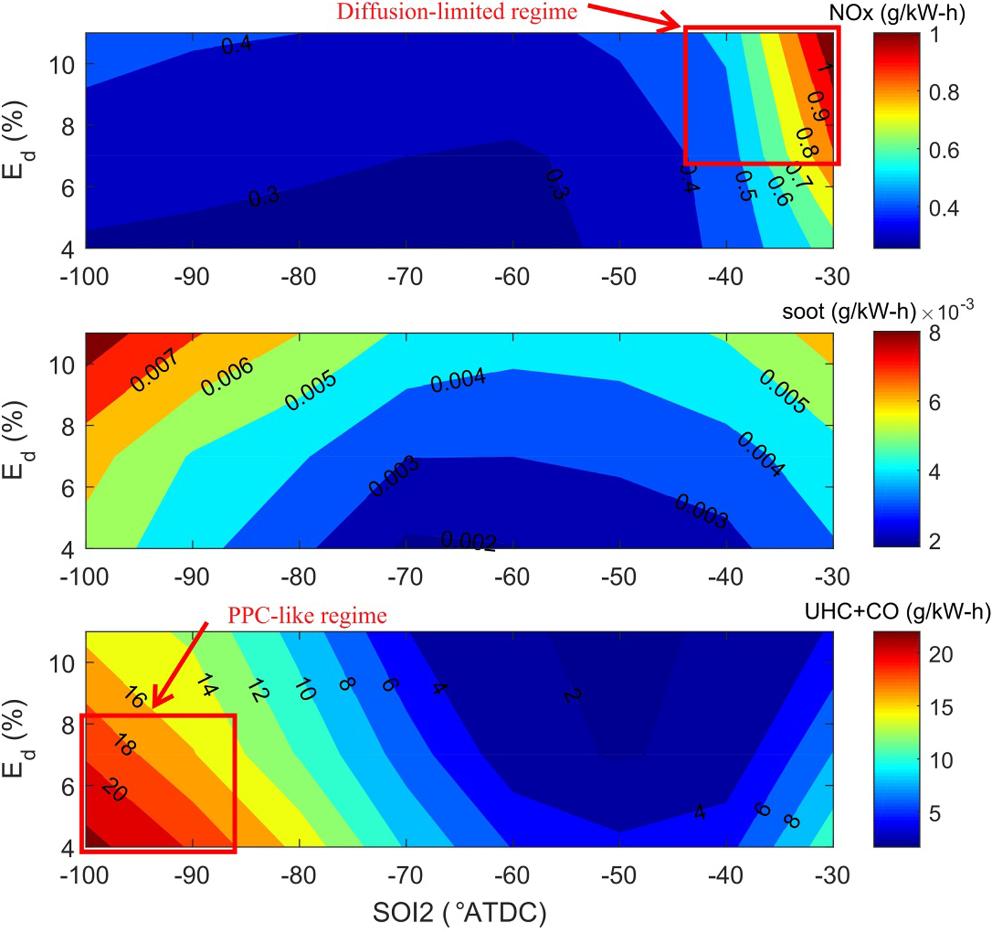 In2006,Kalghatgietal. [12] performedaninvestigationtoovercomeHCCIlimitations.Theyfoundthattheuseoffuelwithhigher resistancetoauto-ignitioncomparedtodieselcouldextendcombustion durationwithouttheneedforEGR.Itwasreportedthattooearlyinjectiontimingsprovideawell-mixedchargeforcombustion,andthis method,namedPartiallyPremixedCombustion(PPC),ledtolower levelsofNOX andsoot.GasolinePPCwasfoundasanewmethodto controltheheatreleaseratebetterthandieselHCCI.However,this concepthadchallengesforaPPCenginefueledbygasolinewithan octanenumbergreaterthan90atlowloads.Inordertoachievebetter control,sparkassistancewasprovided,andadoubleinjectionstrategy wasusedtoreachbetterperformance,butNOX andsootwereatunacceptablelevels [13–17]