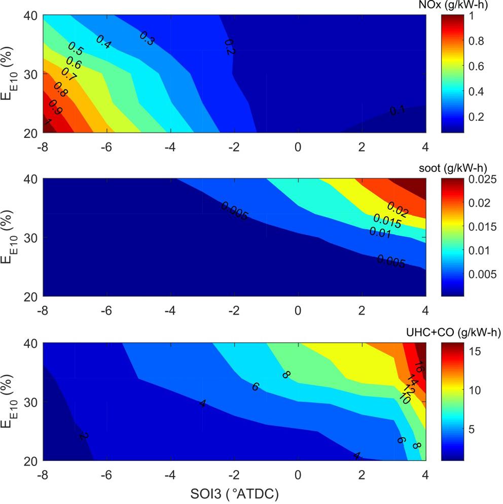 EthanolcanbeusedwithpuregasolineinSparkIgnition(SI)enginesfordifferentcompressionratios.ItwasreportedthattheapplicationofalcoholinSIenginesunderoptimizedconditionscanenhance enginebrakethermalefficiencyandemissionswhencomparedwith baseline [40].Dieselenginesgenerallyhavehigherefficiencycompared togasolineengines,butthisefficiencyisatrade-offbetweensootand NOX.Infact,asimultaneousreductioninNOX andsootisdifficultin conventionaldieselcombustion.Manyscholarshavestudiedtheeffects ofusingethanolindieselenginesnotonlyasasubstitutionfordiesel butalsoforreducingNOX andsootsimultaneously [41–44].Fromthe studiesperformedbyscholarsontheeffectsofethanol/dieselblend properties,itwasfoundthat30%ethanolbyvolumeindieselnotonly haslittleeffectsonfuelatomizationbutalsoincreasesignitiondelay andimprovescombustionefficiency.Inaddition,NOX andsootlevels canbeimprovedundercertainconditions [45–48].Otherresearches wereperformedontheeffectsofdifferentalcoholfuelssuchasmethanolandbutanolindieselfuel.Itwasfoundthattheapplicationof alcoholfuelsincreasesfueloxidization,NOX,andthermalefficiency whileitsignificantlyreducessoot [49–51].