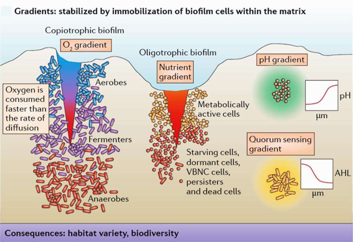 Flemmingetal.(2016) showedthatbacteriaintheupperlayersofaerobicoligotrophic biofilmsarelikelytoconsumethemajorityofthenutrients,causingstarving microorganismsinthebottomlayers(Fig.1.2).Thesemicrobesadapttosluggishgrowth states,suchasinactivecells,orevencelldeath.Othergradientsinbiofilmsproducedby heterotrophicmetabolismincludepHgradientsandgradientsofsignalingchemicalsthat varywithdistancefromgeneratingcells.