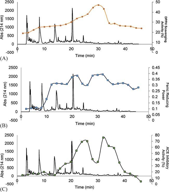 Fig.8 Reversed-phasechromatographicseparationafter invitro gastrointestinaldigestionofanAlcalasehydrolysateoforangeby-productsfortheproductionofbioactive peptidesaftergastrointestinaldigestion.Thefigureshowsthefractionsfrom44to 54obtainedafterSECseparation.Thefractionswereautomaticallycollectedand assayedfortheirDPPHscavengingactivity(A),ferricreducingcapacity(B),ACEIinhibitoryactivity(C) α-amylaseinhibitoryactivity. ReproducedfromMazloomi,S.N.; Mahoonak,A.S.;Mora,L.;Ghorbani,M.;Houshmand,G.;Toldrá,F.PepsinHydrolysisof OrangeBy-ProductsfortheProductionofBioactivePeptideswithGastrointestinal ResistantProperties.Foods2021,10,679.