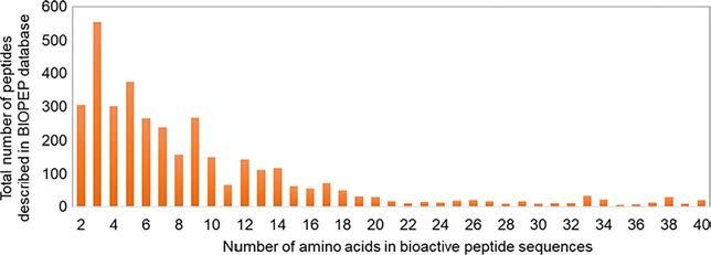 Thesepeptidesareverydifferentandcanshowdifferentcharacteristics suchaschargestate,hydrophobicityorlength,includinglarge,medium, andsmallpeptides.However,smallbioactivepeptides(from2to10amino acidslength)representbyfarthelargestcategoryasindicatedin Fig.5 (obtainedfromBIOPEPbioactivepeptidesdatabase),probablyduetotheir smallsizemakesthemmoreadequatetocrosstheintestinalbarrierand achieveintactthebloodstreamandtargetorganstodeveloptheirbiological activity.Thus,despitethenumerousdifficultiesthatinvolvetheanalysisof smallpeptides,morethanhalfofthepeptidesdescribedintheliterature andincludedintheBIOPEPdatabase(Minkiewiczetal.,2019)aresmaller than6aminoacidslength(see Fig.5).