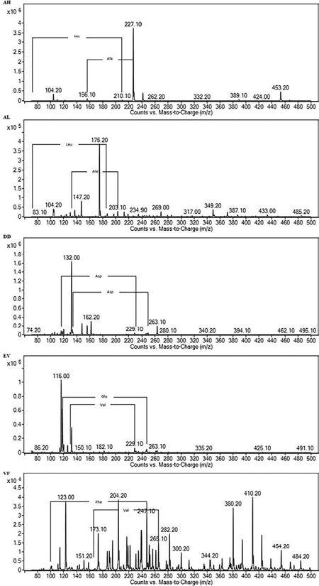 Fig.7 ESI-QQQspectraofthedipeptidesAH,AL,DD,EVandVFidentifiedin18months dry-curedhamextracts. Source:ReproducedfromAlejandroHeres,CeliaSaldaña,Fidel Toldrá,LeticiaMora,(2021).IdentificationofdipeptidesbyMALDI-ToFmassspectrometry inlong-processingSpanishdry-curedham,FoodChemistry:MolecularSciences,3,100048, withpermissionfromElsevier.
