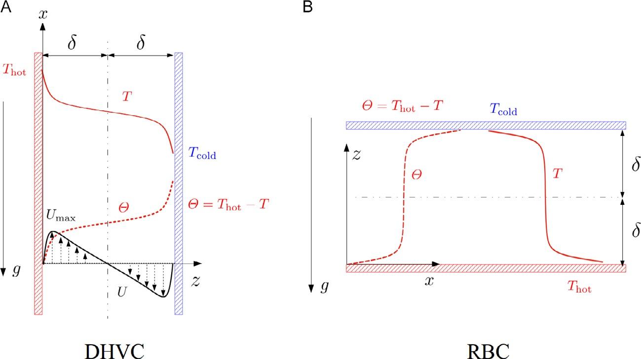Tounderstandtheessentialphysicsofbuoyancy-driventurbulence, convectionwithsimplegeometryistypicallyusedinphysicalexperiments ornumericalsimulations.Twobuoyancy-drivenconvectionswithsimple geometryareillustratedin Fig1:differentiallyheatedverticalchannel (DHVC)andRayleigh-Benardconvection(RBC).Inbothcases,flow andheattransportoccursbetweentwoparallelplates,whicharemaintained atdifferenttemperatures.InDHVC,thetemperaturegradientisperpendiculartothegravity,butinRBC,thetemperaturegradientisalignedwiththe gravity.InDHVC,hotterfluidascendsalongthehotplateside,andatthe sametime,colderfluiddescendsalongthecoldplateside.Inturbulent RBC,aprominentfeatureistherisingupofhotfluidasplumesandfalling downofcoldfluidasinvertedplumes.