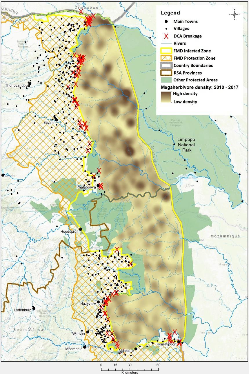 Fig.2 Megaherbivore(Africanbuffaloandelephant)densityacrossKrugerNational Parkandfencebreakages(redcross)fromdamagecausinganimals(DCAs).Elephant causemostbreakagesenablingdiseasedbuffalotoescape.Footandmouth(FMD)veterinarycontrolzonesandnearbyvillagesarealsoshown. MapproducedbytheSkukuza GISOffice.