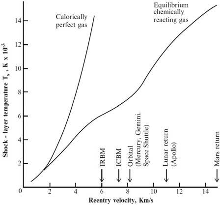 Inhypersonic fl ow,temperatureovercomesathresholdbehindastrongshockwave, andtheaircannotbeconsideredasaperfectgas.Thevariationoftemperaturebehind anormalshockwaveforvariousfree-streamvelocitiesforavehicle flyingatastandard