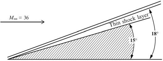 Theshocklayerisknownasthe flowregionbetweenthebodyandtheshockwave.In thehypersonicregion,thislayerisverythin,asdemonstratedin Fig.1.11,i.e.,the angleoftheshocklayerisabout18degreesforawedgeof15semi-anglesina fl owat M ¼ 36whenstandardobliqueshocktheoryisappliedandtheairstreamis consideredaperfectgas.Byconsideringrealgasconditions,theseanglesalso decrease.Inhypersonic flow,theshocklayeristhinandhighlyclosetothemain body.In1687,IssacNewtonproposedathinshocklayertheoryformodelinghypersonic flow.Thismodelwaspresentedfortheestimationofthepressuredistribution overthesurfaceofahypersonicbody.