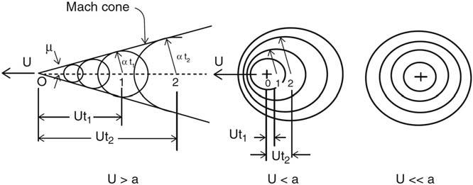 oftheacousticwavesfromamovingsource(Viviani & Pezzella,2015).Consequently, whenthespeedofthesource, U,islessthansoundvelocity(a),theacousticwaveswill informthenearby fluidoftheupcomingofthesource.Ontheotherhand,theinformationcannottransmitbeyondthesourceandislimitedtoaconeofinfluence,calledthe Machconewhenthesourcemovesfasterthansonicvelocity(a).