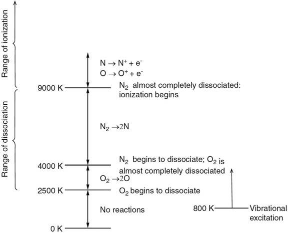 Thepropertiesofthegaschangealthoughachemicalreactiondoesnotoccur.When thetemperaturereachesabout2000K,theO2 dissociationsinitiate.Atthe4000K,the O2 dissociationisfundamentallycomplete;mostoftheoxygenisintheformofatomic oxygen,O.Furthermore,N2 initiatestodissociateat4000KandallofN2 dissociated whenthetemperaturereachesat90(X)K. Fig.1.6 summarizesthedissociationprocess indifferenttemperatureranges. Fig.1.7 confi rmsthathigh-temperaturegaseffectsare conventionalinthealtitude velocitymap.