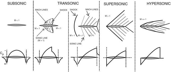 Torecognizethemaindifferencebetweenthese flowtypes, Fig.1.5 demonstratesa prominent flowstructurearoundanairfoilwhenthevelocityofthefreestreamvaries (Viviani & Pezzella,2015).Asshowninthis fi gure,theformationofdifferentshocks andtheiranglesarethemainchangeswhenthefreestreamvelocityincreases.