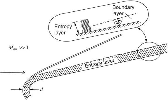 Asdepictedinthe figure,the “entropylayer” extendsdownstreamalongthebody forlargedistancesfromthenose.Inthislayer,theentropygradientishigh,andthe boundarylayeriswithinthislayerandthisentropygradientaffectsthehydrodynamic boundarylayer.