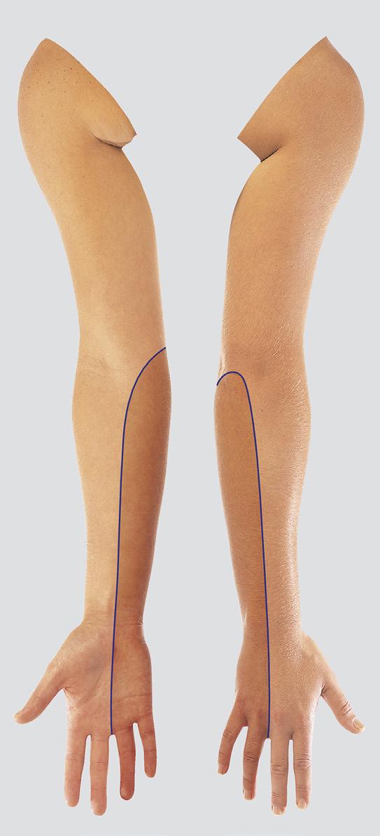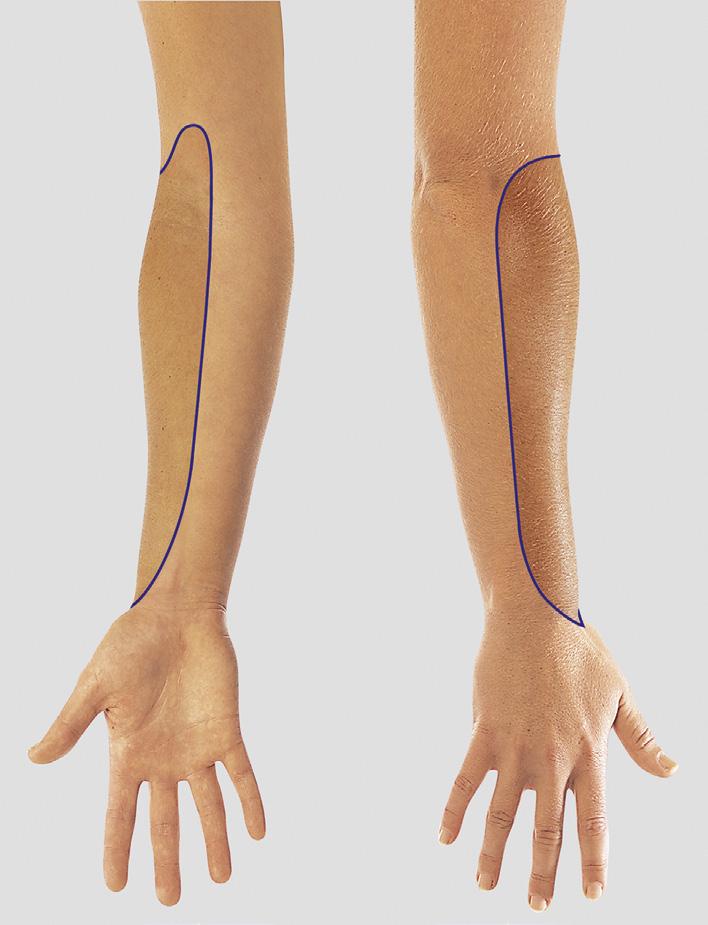 Superficial radial nerve: the nerve may be compressed against the radius at the lateral border of the forearm
