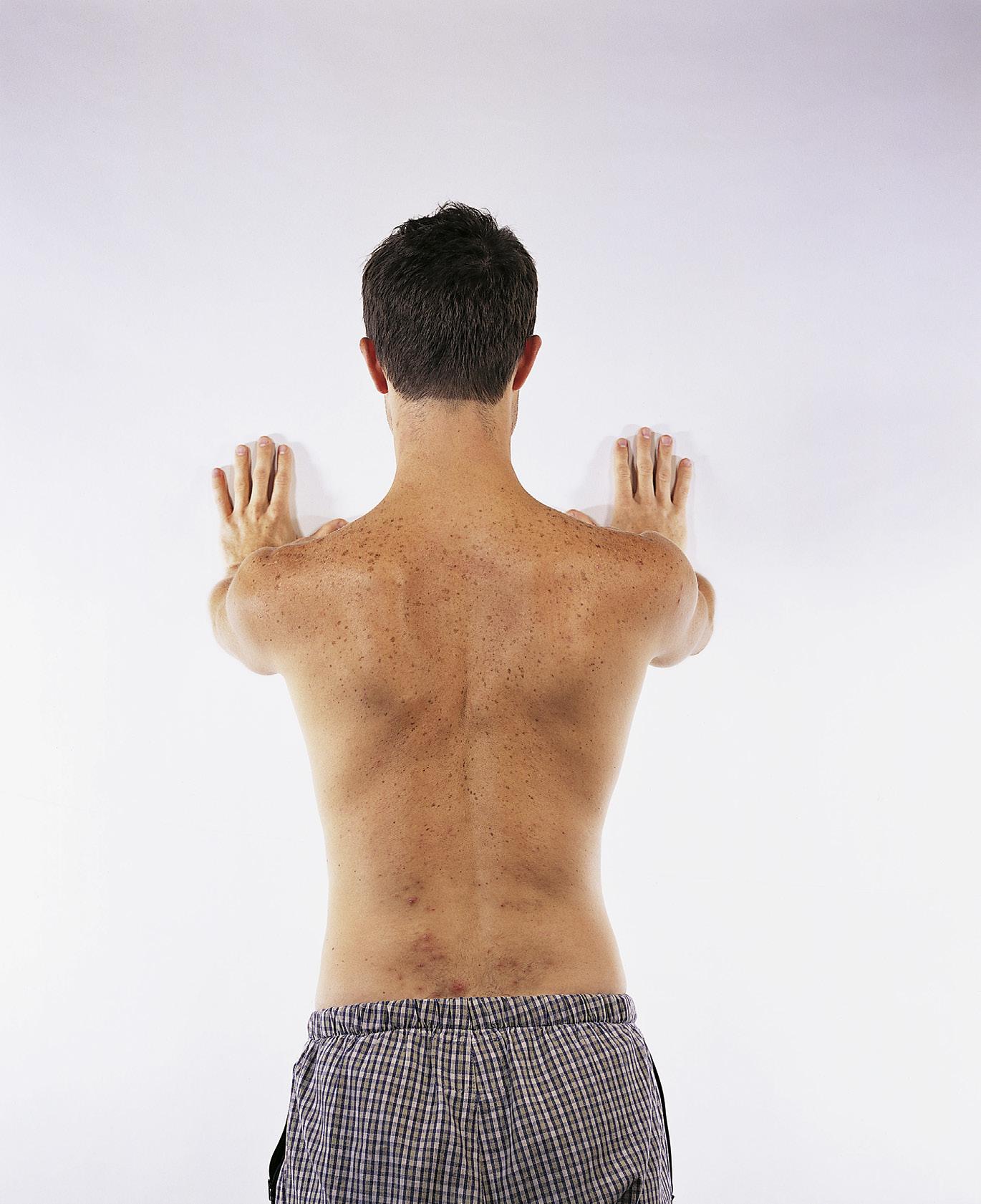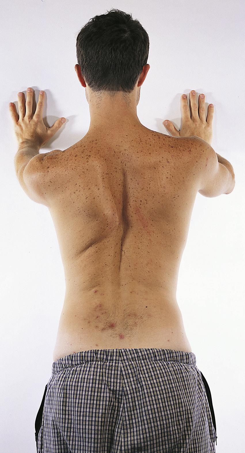 Fig. 3 Trapezius (Spinal accessory nerve and C3, C4). The patient is pushing the palms of the hands hard against a wall with the elbows fully extended.