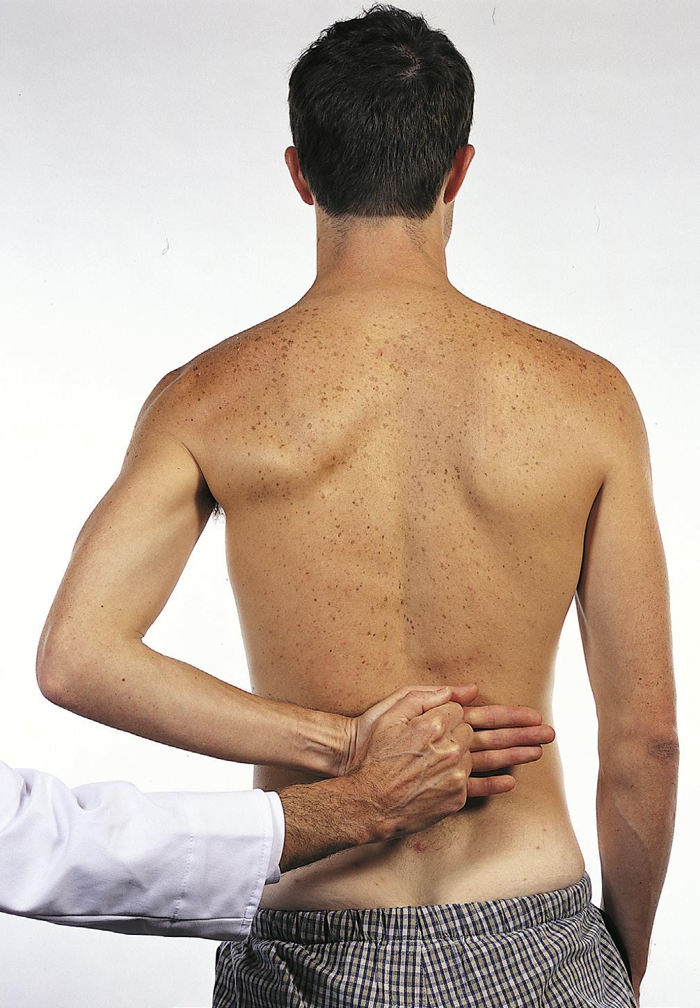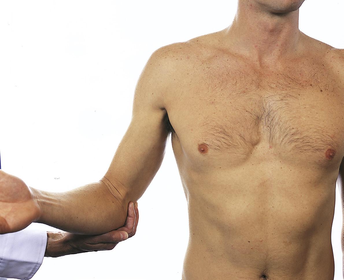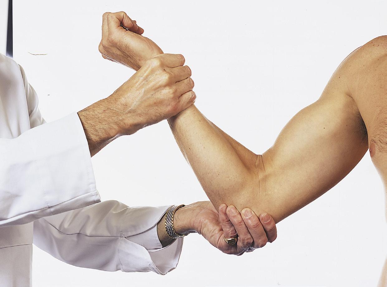The patient is pressing the palm of the hand backwards against the examiner’s hand. Arrow: The muscle bellies can be felt and sometimes seen.