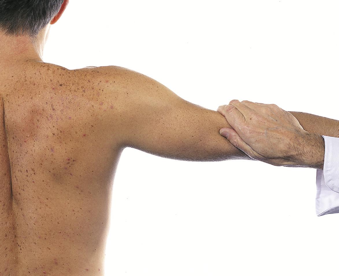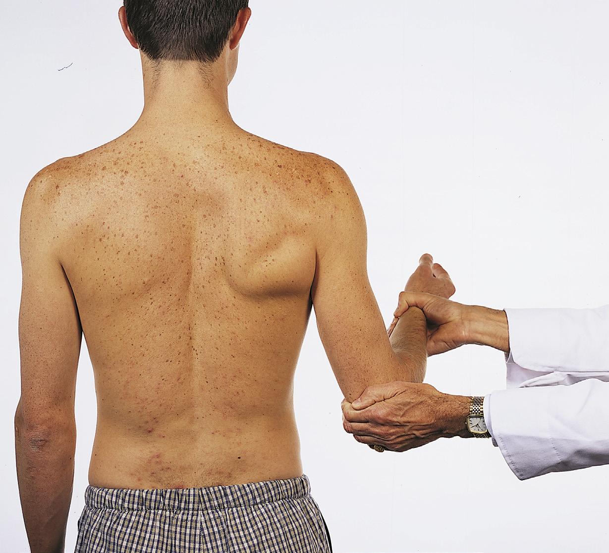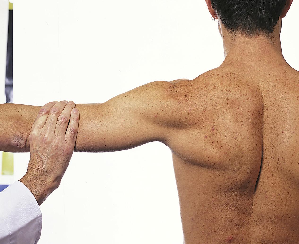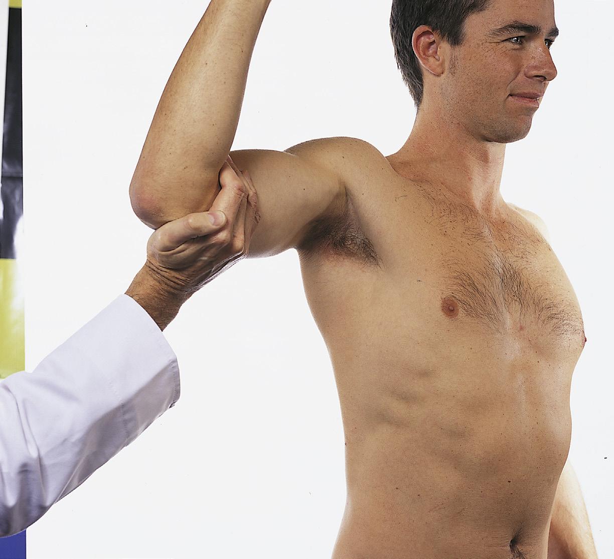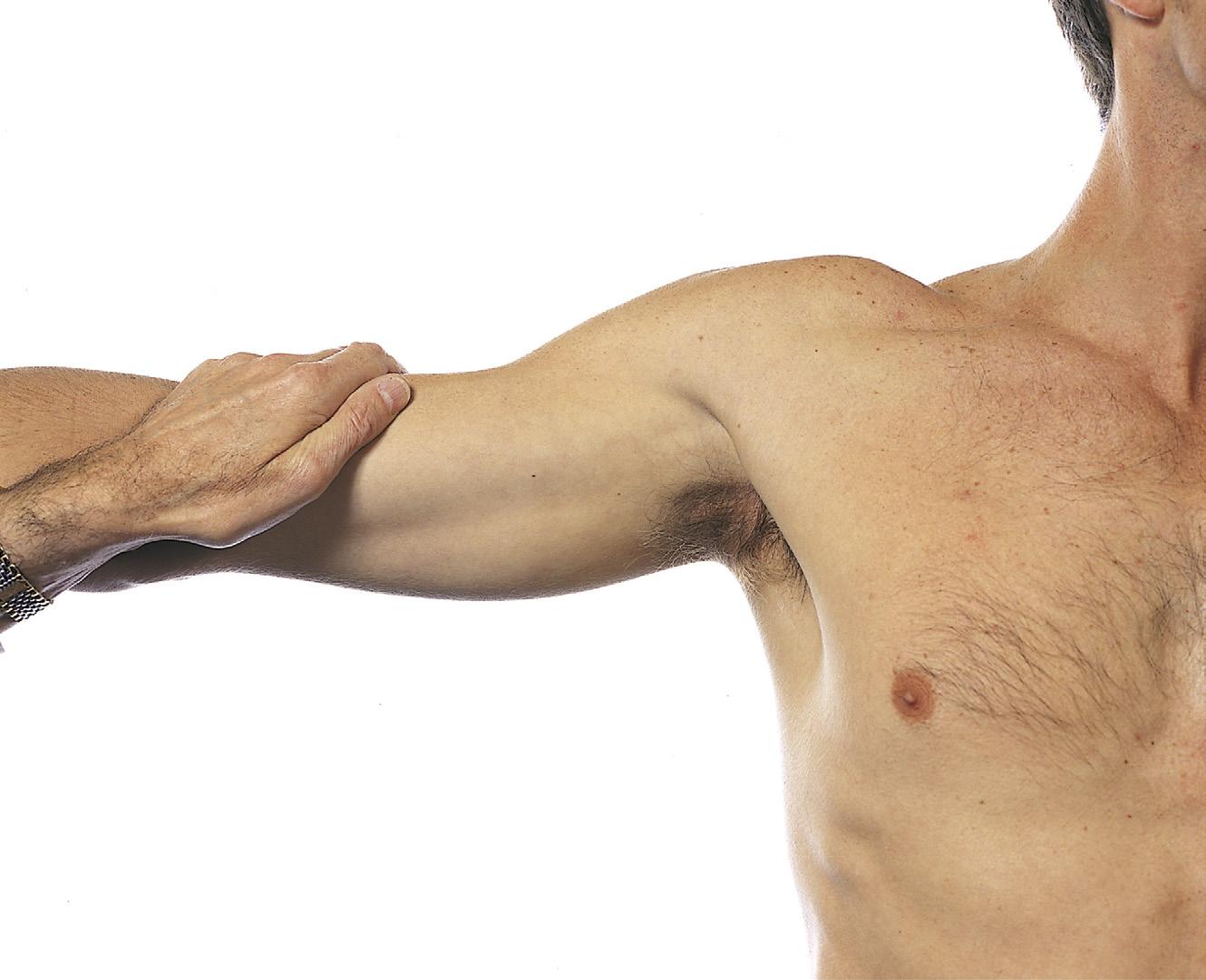 The patient is externally rotating the upper arm at the shoulder against resistance. The examiner’s right hand is resisting the movement and supporting the forearm with the elbow at a right angle; the examiner’s left hand is supporting the elbow and preventing abduction of the arm.