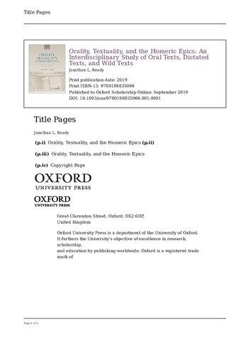 Orality, Textuality, and the Homeric Epics: An Interdisciplinary Study of Oral Texts, Dictated Texts, and Wild Texts Jonathan L Ready