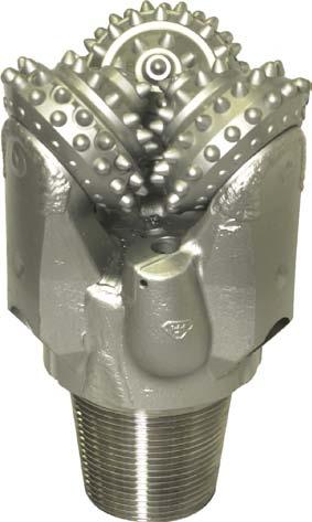 Rotarydrillingforgeothermaldeposits(i.e.,naturalsteamandsuperheated geothermalwaters)requiresdrillingthrough “hardrock,” metamorphicand igneousrock(aswellassedimentaryrock).However,thedeepdrillingofboreholesfortherecoveryofcrudeoilandnaturalgasisalmostexclusivelycarried outinsedimentaryrock.Therotarydrillingmethodrequirestheuseofarock cuttingand/orcrushingdrillbit. Figure2-1 showsatungstencarbideinsert tri-conerollerconebit.Thistypeofdrillbitusesmoreofacrushingactionto advancethebitintherock(see Chapter4 formoredetails).Thesebitsareused primarilytodrillmediumhardsedimentaryrock.