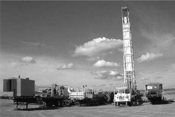 Figure2-3 showsatypicalsingledrillingrig.Suchsmalldrillingrigsarehighly mobileandareusedprincipallytodrillshallow(lessthan3000ft,or 900m in depth)coal-bedmethanewellsandgeothermalhotwater-producingboreholes. Thesesinglerigsareusuallyself-propelled.Theself-propelleddrillingrigin Figure2-3 isaGardnerDenverSD55.ThisparticularrigusesRange2drillpipe. Singlerigscanbefittedwitheitheranon-boardaircompressororanonboardmudpump.Someoftheserigscanaccommodatebothsubsystems.These rigshaveeitheradedicatedprimemoverontherigdeckorapower-take-offsystemthatallowsutilizationofthetruckmotorastheprimemoverforthedrilling rigequipment(whenthetruckisstationary).Smalldrillingrigsusuallyprovide theaxialforcetopushthedrillbitintotherockfaceviaachainorcable-actuated pull-downsystem,orahydraulic-actuatedpull-downsystem.Apull-downsystemtransfersaportionoftheweightoftherigtothetopofthedrillstring andthenthroughthedrillstringtothedrillbit.Thetorqueandrotationat thetopofthedrillstringarealsooftenprovidedbyahydraulictop-headdrive (similartopowerswivelsystemsusedonlargerdrillingrigs),whichismovedup anddownthemast(onatrack)bythechain,cable,orhydraulicdrivepull-down system.However,someoftheserigsretainthetraditionalrotarytable.Manyof thesesmallsingledrillingrigsarecapableofdrillingwiththeirmastsatanglesas highas45° angletothevertical.Theprimemoverfortheserigsisusuallyfueled byeitherpropaneordiesel.