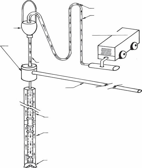 TOP HEAD ROTARY DRIVE OUTER PIPE INNER PIPE FIGURE2-8 Reversecirculationoperationschematicusingdualwalldrillpipegivinganearly closed-loopcirculation.