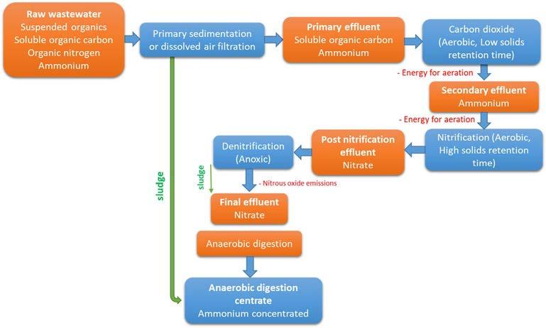 Fig.1.3 explainsthestandardwastewatertreatmentprocess,includingprimary,secondary,andfinalprocessingstages.RawwastewaterusuallycomprisesorganicNthatcan quicklydegradeintoammonium.OrganicNandinorganicN,includingurea,andsuch wastewatercouldbeusedtogrowfilamentousalgae.Putatively,itisfavorabletocultivate freelysuspendedcellsoffilamentousalgaeinrawwastewater.However,theexistenceof asuspendedsubstanceinwastewatermakesittooturbidandblockslightpenetration, inhibitingalgae’sphotosyntheticactivity.Thesolidwastespresentinthewastewatercan betypicallyremovedthroughtheprimaryprocessofsedimentationordissolvedairflotation togetarelativelyperfecteffluentthathassolubleorganiccarbonandammonium [21].