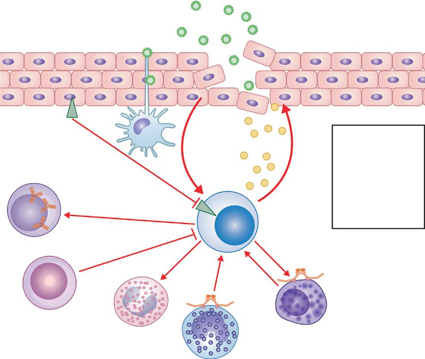 The role of IL-25, IL-33, and TSLP in promoting a Th2associated milieu is summarized in Fig. 1.7. In this model, injured epithelium has a central role in driving allergic inflammation through its ability to produce these cytokines. TSLP acts primarily on DCs to drive them to induce a Th2-like process. In addition, both IL-25 and IL-33 act directly on mast cells to drive their repertoire of Th2-associated cytokines. More important, IL-25, TSLP, and IL-33 act on ILC2 to increase their selective production of IL-5 and IL-13. These actions on ILC2 and mast cells can occur independent of ongoing allergen exposure, suggesting a mechanism for allergen-independent perpetuation of allergic inflammation.