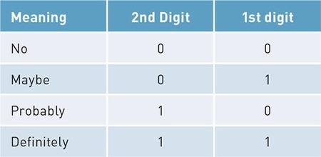 Here we have started to use two binary digits—two bits—to create a code book for four different messages that we might want to transmit to our friend about her dinner party. If we were certain that we would not attend, we would send her the message 0 0. If we definitely planned to attend, we would send her 1 1. But we have two additional possibilities, “maybe,” which is represented by 0 1, and “probably,” which is represented by 1 0. It is interesting to compare our original yes/no message of one bit with this new four-option message with two bits. In fact, every time you add a new bit you double the number of possible messages you can send. So three bits would give 8 options and four bits would give 16 options. How many options would there be for five bits?
