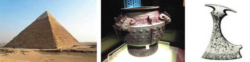 (a)TheGreatPyramidofGiza(ca.3000BCE);(b)abronzevaseofChina(ca.1300BCE);and(c)ironaxefrom Sweden(ca.1500ago).