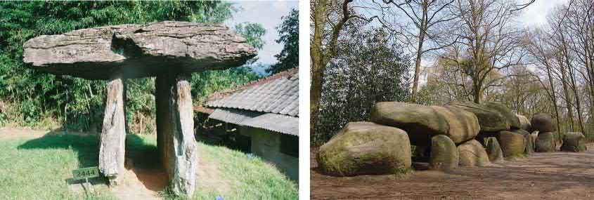 Megalithicman-madestructuresfromtheStoneAge:(a)SinglechambertombinKorea(ca.the9thmillennium BCE);(b)StonestructuresinthemunicipalityofBorger-Odoorn,Netherlands(ca.the4thmillenniumBCE).