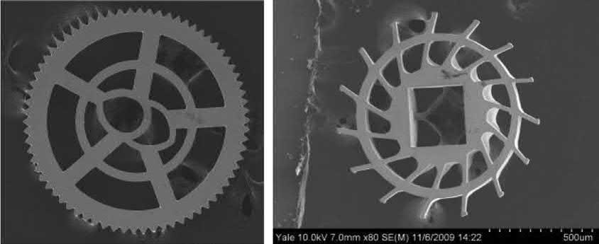 Unlikethetraditionalsteelmaterials,metallicglassesbecomemoreductile(lessbrittle)inextreme cold,whichmakesthemmoreappropriateforrobotsworkinginspaceoronicyplanets.TheresearchersandengineersfromNASAJetPropulsionLaboratory(JPL)designedatesttoestimatethe potentialbenefitofmetallicglassincreatingroboticgearsforspacecomparedtoceramicsandsteels. Agearisessentialintheprecisionroboticsandrequiredwhentherobotsperforminspacemissions. ResultsfromJPLshowthatthegearsmadefrommetallicglasscantransmithightorqueandsmooth turningwithoutlubricantevenattemperaturesaslowas76K.Amongvariousmetallicglasses,CuZrbasedCu43 Zr43 Al7 Be7 MGexhibitsexcellentwear-resistancewitha60%improvementthrougha superiormethodofgear-to-geartestingcomparedtohigh-performancesteelVascomaxC300whichis usedcurrentlybyNASAonMarsroverCuriosity.Itisindicatedthatthenatureoftoughnessismore importantthanhardnesswhenconsideringgearwear,whichiscontrarytotraditionalclaims.Inthis test,theMGsgearwasfabricatedbyanet-shapedcastingwithoutpost-machining,whichcanimprove thewear-performanceandlifetimeofMGgearbutwithasuperiorsurfacequalitytothatofelectric dischargemachinedgears.Somepatentshavebeenappliedforinthisfieldrecently.Examplesofgears manufacturedfrommetallicglassesareshownin Fig. 2.1.1.