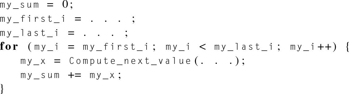 After each core completes execution of this code, its variable will store the sum of the values computed by its calls to . For example, if there are eight cores, , and the 24 calls to return the values